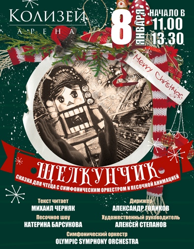 8 января на сцене концертного зала «Колизей» оживет одна из самых чудесных рождественских историй. Дети и их родители смогут вновь вспомнить, а может и познакомиться, с трогательной и волшебной историей Мари и Щелкунчика. Вместе с героями зрители, конечно, победят мышиного короля, смогут увидеть Леденцовый луг, посетить Конфетенбург, прогуляться вдоль Апельсинового ручья и, потанцевать в Марципановом замке. Помогать творить чудеса будут симфонический оркестр Olympic Orchestra, мастер песочной анимации Катерина Барсукова и Заслуженный артист России, голос, которого, без сомнения, узнают взрослые, но ещё быстрее маленькие любители «Лунтика», «Барбоскиных» и «Смешариков», Михаил Черняк.