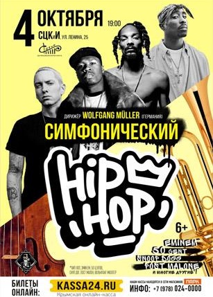 Песни знаменитых хип-хоп музыкантов в исполнении симфонического оркестра. Интерпретация треков Eminem, 50 Cent, Snoop Gog, Post Malone. Начало 4 октября в 19:00 в Севастопольском центре культуры и искусств.