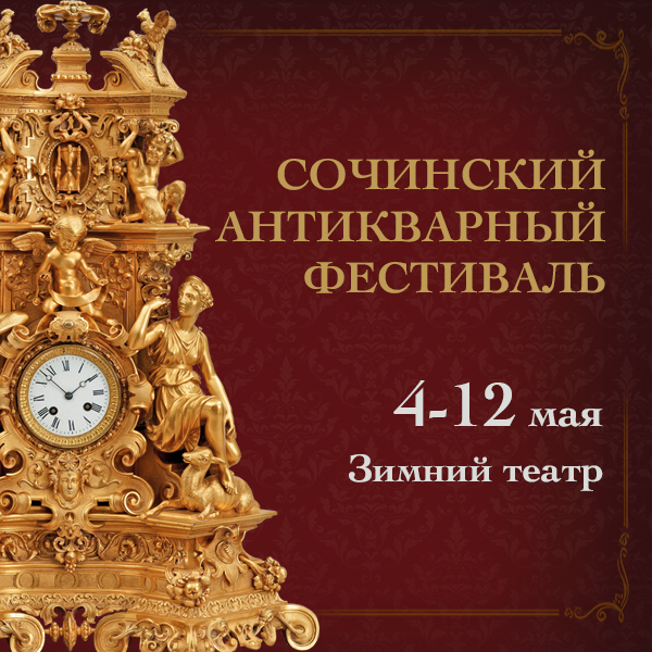 11 мая в рамках Сочинского антикварного фестиваля пройдет антикварный аукцион. Предаукционный показ лотов будет проходить с 4 по 11 мая на одном из стендов основной зоны антикварного салона, а сам аукцион в оборудованном конференц-зале на втором этаже Зимнего театра.