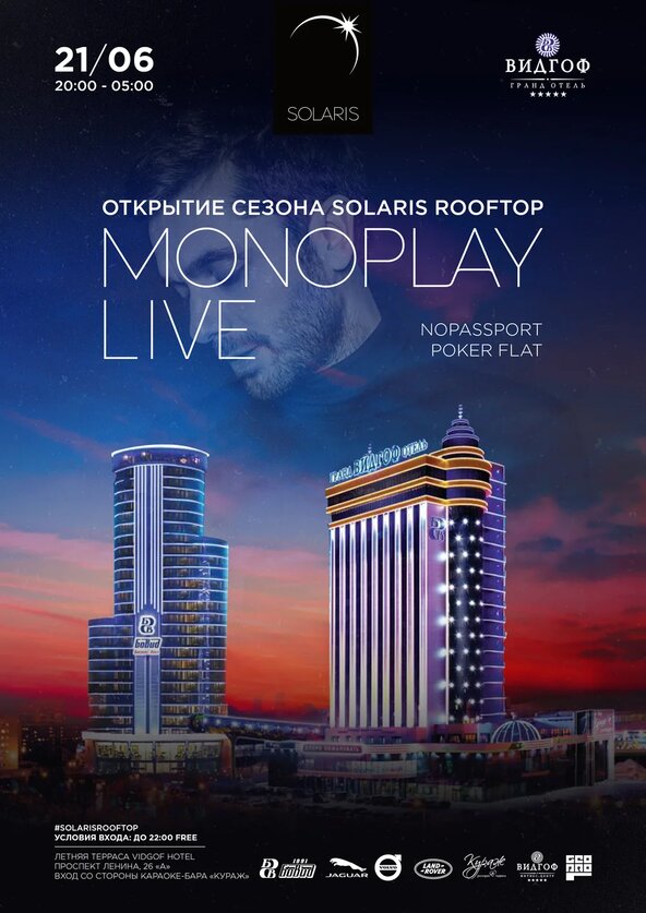 Премьера серии руфтопов Solaris состоится уже 21 июня и соберет вместе самых красивых и веселых людей города. Специальный гость первой вечеринки – Monoplay. Это новый проект московского музыканта Раха Меджитова, который с 2005 года известен как певец и продюссер. Monoplay – live-проект свежего взгляда на электронное звучание. Необычное переплетение вокала и музыки завораживает и подталкивает к танцу и улыбке.