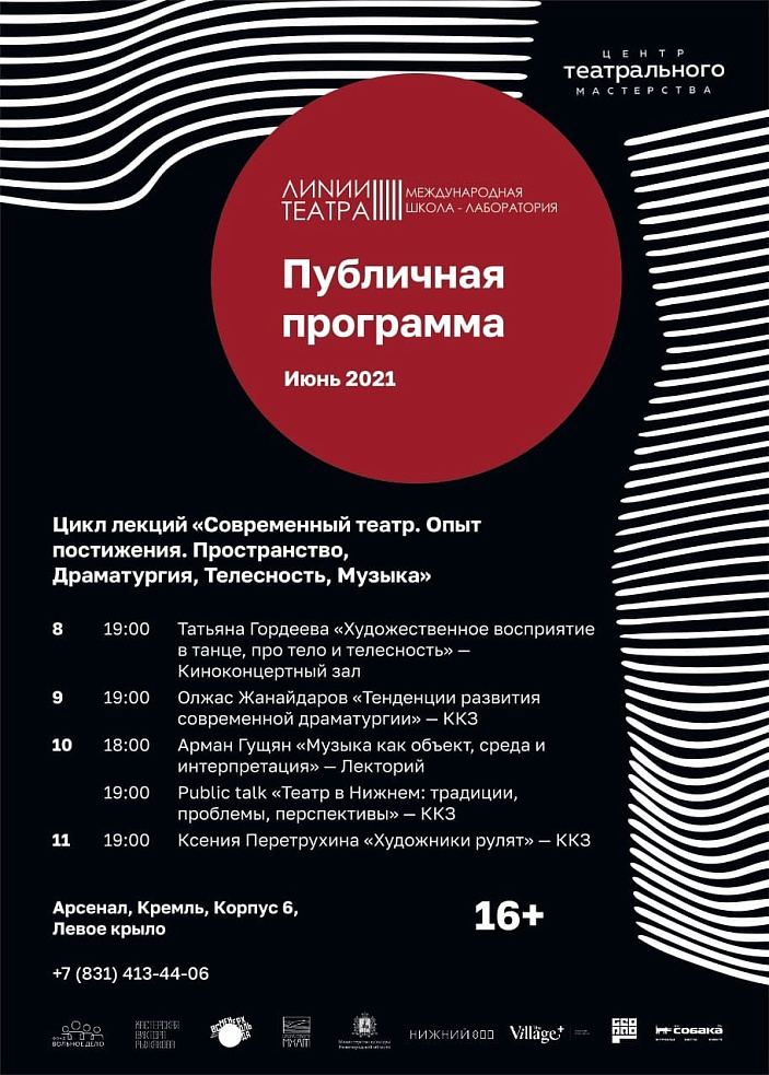 Публичная программа лекций и public talk международной школы-лаборатории «Линии театра» проходят на территории ГЦСИ «Арсенал» (16+).