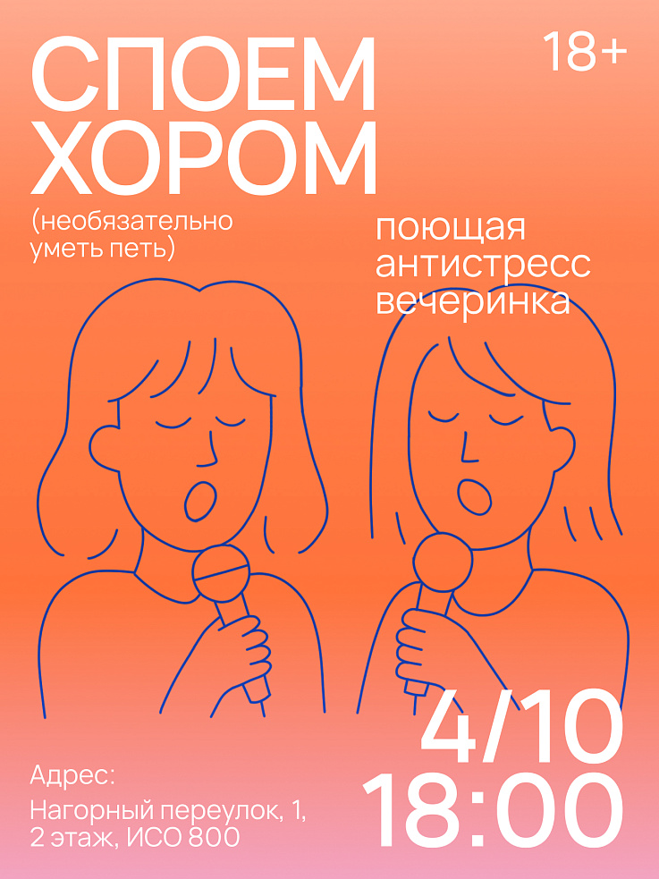 Это будет вечерняя субботняя тусовка! Мы встретимся в классном месте, раздадим вам тексты любимых песен и мы просто будем петь. Ну, конечно, под руководством опытного и зажигательного хормейстера.