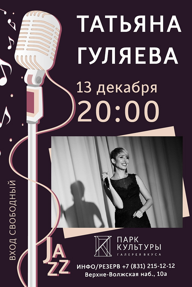 JAZZ-вечер в зале с картинной галереей "Парк Культуры" пройдет в компании обаятельной Татьяны Гуляевой.