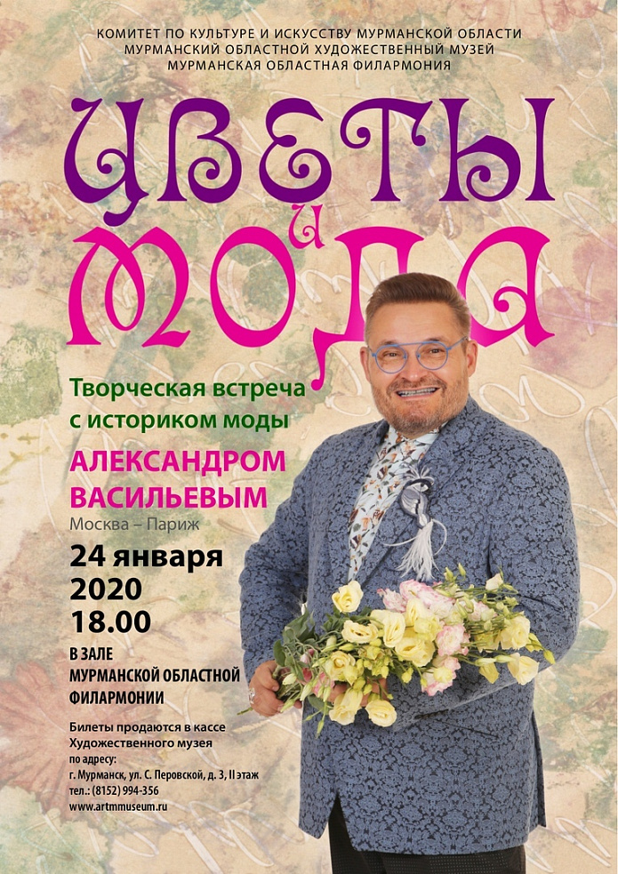 24 января 2020 года в 18.00 в Мурманской областной филармонии состоится творческая встреча с историком моды Александром Васильевым «Цветы и мода».