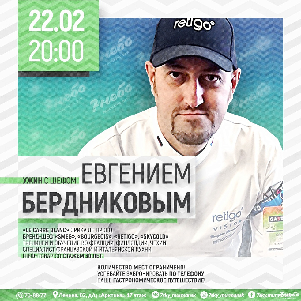 22 февраля «7 Небо» посетит Евгений Бердников — бренд-шеф повар Компании «Smeg» на территории СНГ.