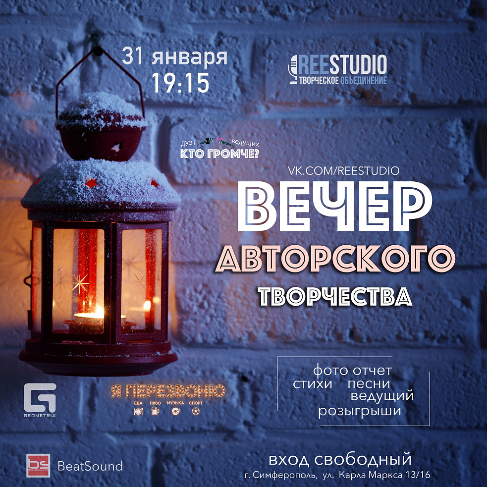Наша Творческая Команда "ReeStudio" ждёт Вас в гости на нашем творческом вечере. Только хорошее настроение и авторское творчество!