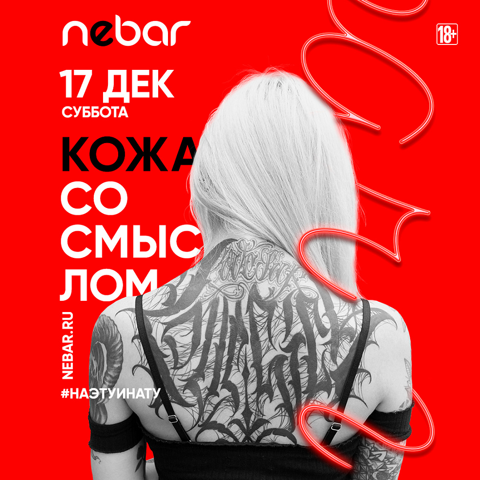 Феодальная секта жестких баров Nebar представляет серию не менее жестких тату вечеринок — «КОЖА СО СМЫСЛОМ». Да, сделай это — #НАБЕЙСЕБЕТАТУ прямо на вечеринке! Мы обещаем #БОЛЬНОНЕБУДЕТ.. Набей фирменную ТАТУ и получи пожизненную скидку во всех «Небарах» страны 30%. Добро пожаловать в #КОМАНДАМЕЧТЫ, одним словом, ты в секте).