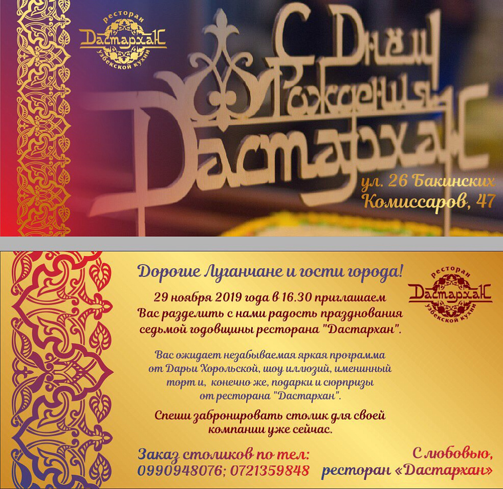 Дорогие друзья, Луганчане и Гости города, 29 ноября 2019 года с 16.30 приглашаем, Вас, разделить с нами радость празднования дня рождения, годовщины ресторана «Дастархан». Нам 7 лет!