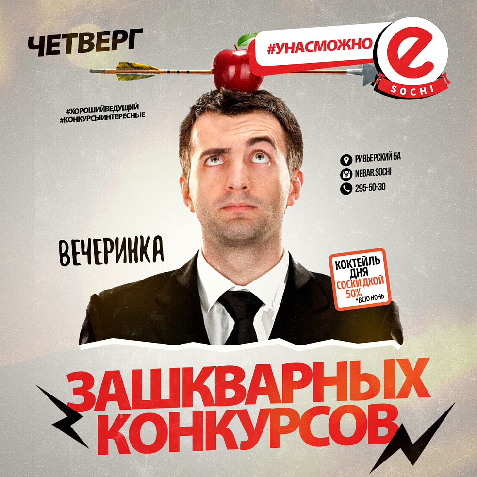 Попади карандашом в бутылку #ТОЛЬКОНЕВМЕНЯ, лопни шарик попой #БОЛЬНОНЕБУДЕТ, перекати яйцо через штанины своего соседа #ДЕЛАЙГРЯЗЬ Это далеко не все зашкварные конкурсы из прошлого, в которых ты можешь поучаствовать или стать свидетелем этой вакханалии и от души поржать. Каждый четверг МС готовит для тебя супер трешовые развечения. стань звездой недели и получи шанс выиграть 1500 Еблей от #nebarfamily. Да,да... #УНАСМОЖНО ну а если ты уже пьяненькая #ДАВАЙСДЕЛАЕМЭТО