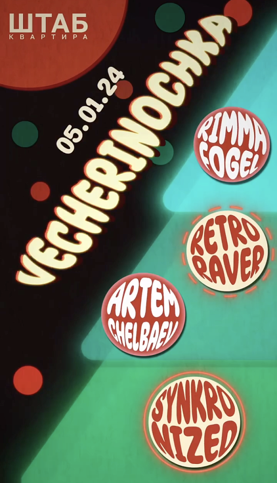 5 января в ШТАБ квартире пройдёт взрывная VECHERINOCHKA под аккомпанемент блестящих, феерических, незыблемых, живописных и, в свою очередь, чрезвычайно зажигательных саундов в исполнении профессиональных дэнсфло-киллеров Нижнего Новгорода, Москвы и Чебоксар: