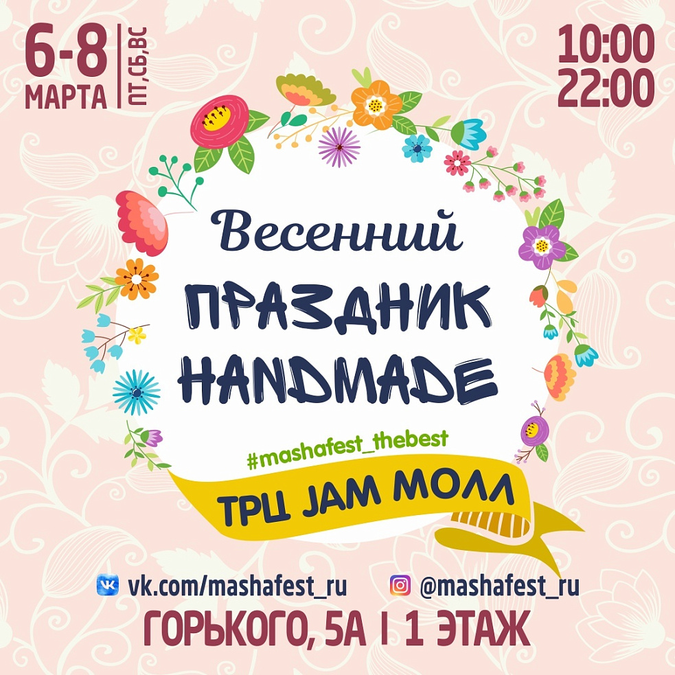 Встречайте весенний праздник handmade с 6-8 марта! Вас ждет ярмарка подарков ручной работы, аквагрим и угощения для детей, розыгрыш призов от мастеров, увлекательные мастер-классы, праздничная фотозона.