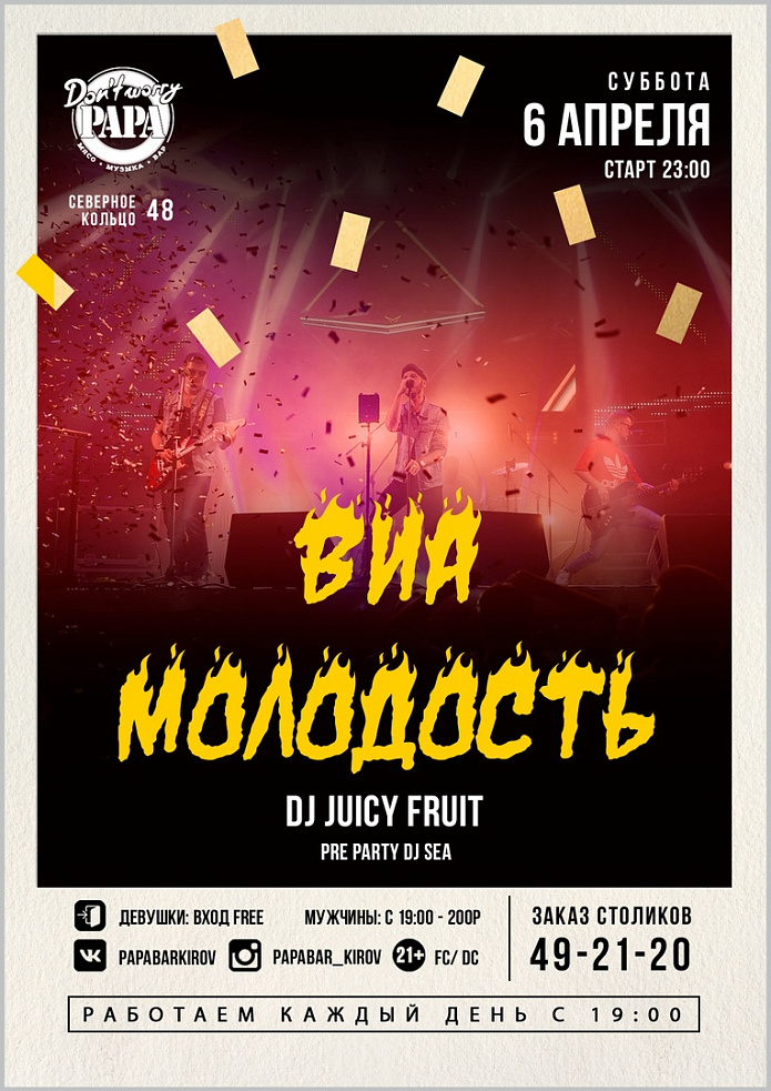 Субботу отмечаем с нашумевшей кавер-группой ВИА МОЛОДОСТЬ в любимом DON'T WORRY PAPA!