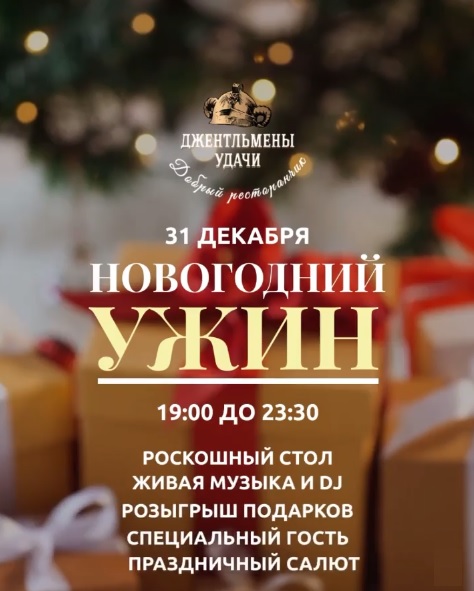 Приглашаем к нам на праздничный ужин! Вас ждёт роскошный стол, живая музыка, розыгрыш подарков и сияющий новогодний салют