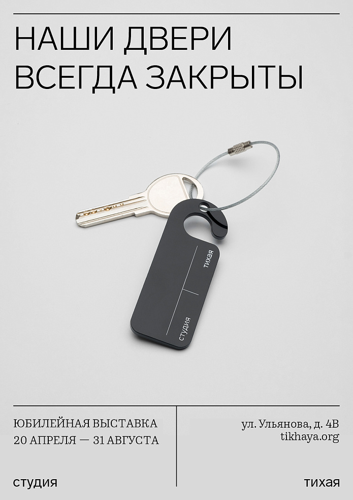 Название юбилейной выставки «Наши двери всегда закрыты» является негласным принципом студии, попасть в которую можно только по договоренности или предварительной записи. Экспозиция, созданная главным куратором «Тихой» Алисой Савицкой, представляет собой фантастический художественный кабинет и объединяет более ста произведений резидентов студии, архивных документов и фотографий.