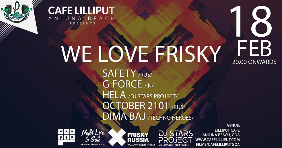 Что же означает We Love Frisky - это серия вечеринок для истинных ценителей мелодики и красивого атмосферного звучания. Наши вечеринки проходят при поддержке лейбла DjStars Project (Moscow), лейбла Techno Heroes, Frisky radio Russia, Geo.Pro GOA и Группы Night Life in Goa.