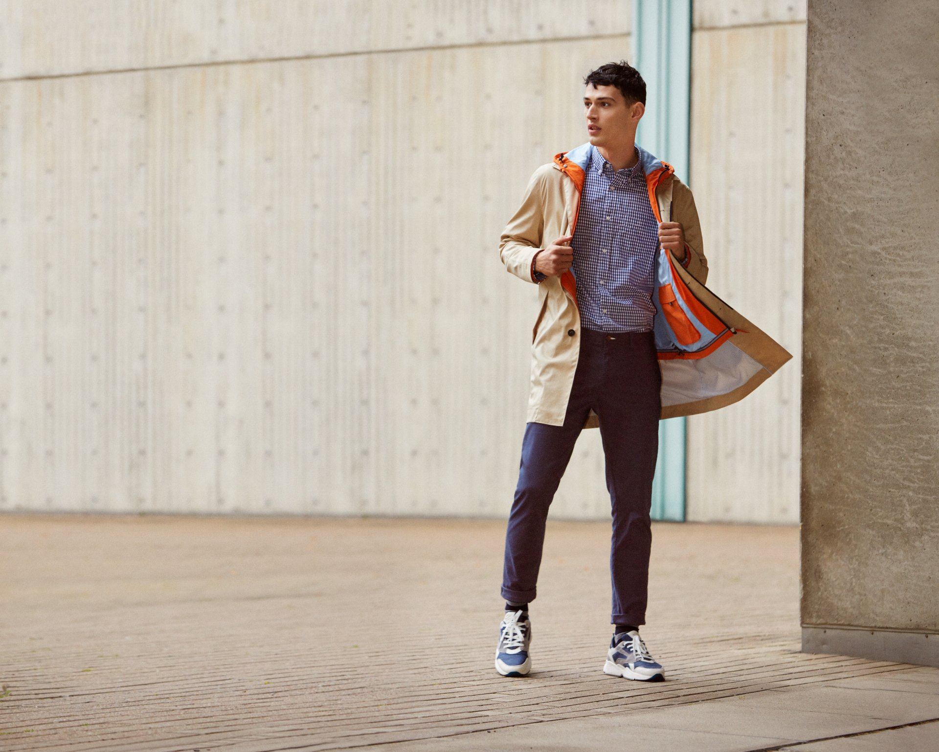 Мужская коллекция бросает вызов городу в классической верхней одежде GANT, дополненной технологией Tech Prep,и сочетает ее со слегка свободными чиносами кроя Hugger fit, элегантной рубашкой и французской рабочей курткой.
