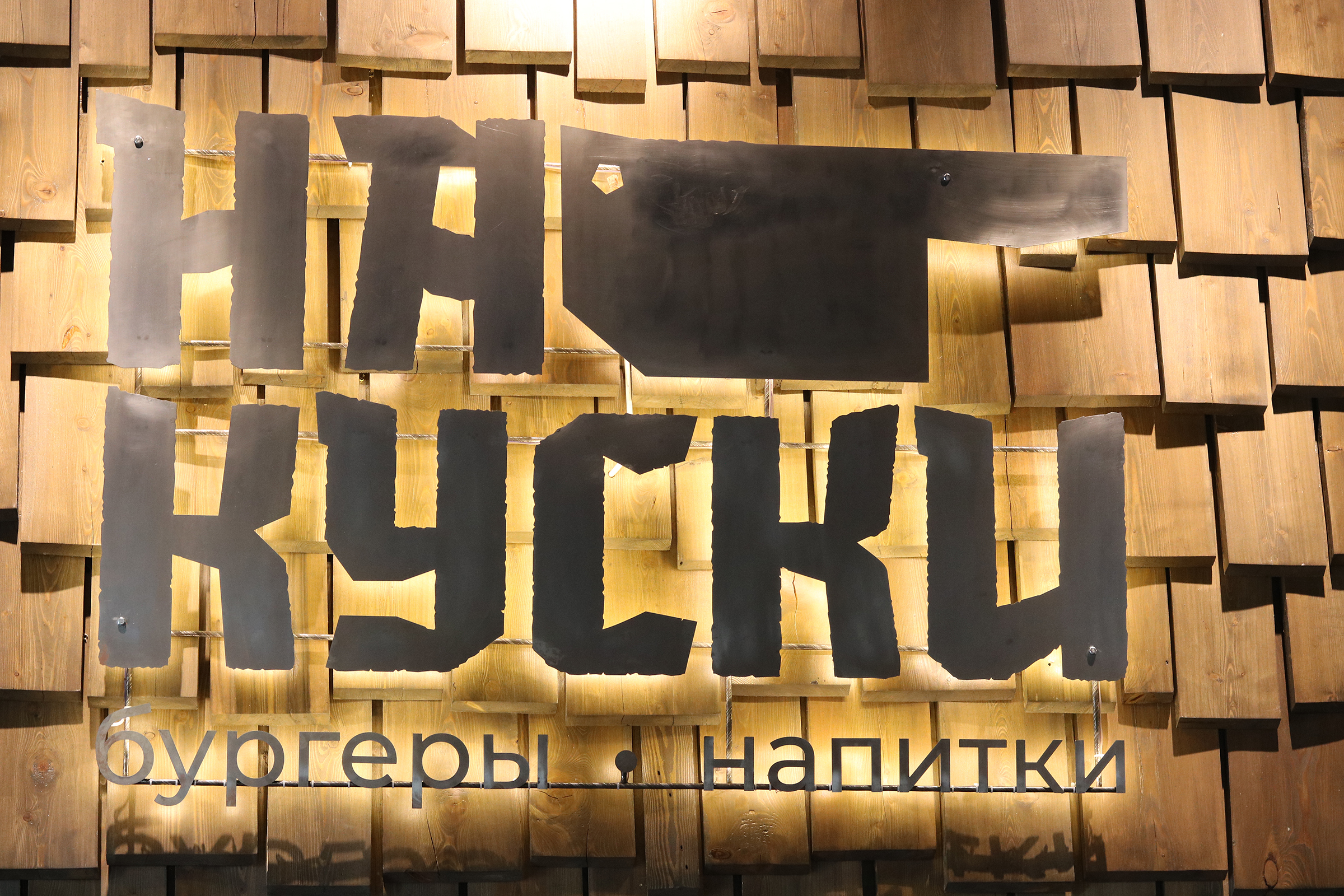 Стиль интерьера можно обозначить как «эко-лофт», где грубые индустриальные фактуры бетона и металлические конструкции дополнены теплотой натурального дерева, используемого в отделке стен и мебели. А центром притяжения стала фотозона с логотипом «На куски», оформленная дранкой из натурального бука. В общем и целом, интерьер получился приятным и спокойным, но в то же время весьма современным, как нельзя кстати подходящим и для молодёжной аудитории. Ведь бургерная находится рядом с Университетом путей сообщения.