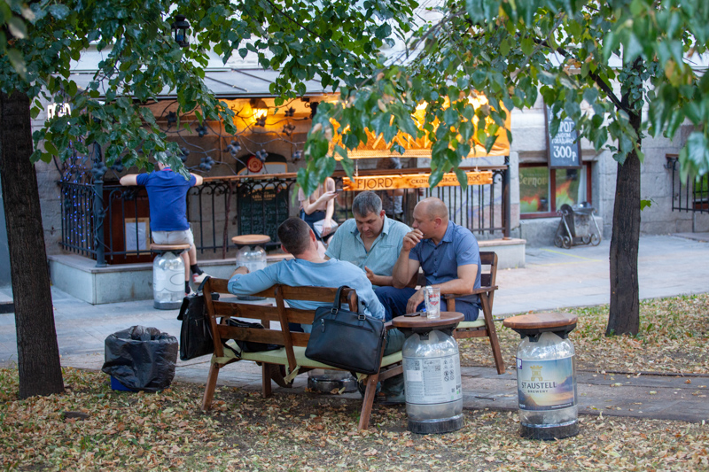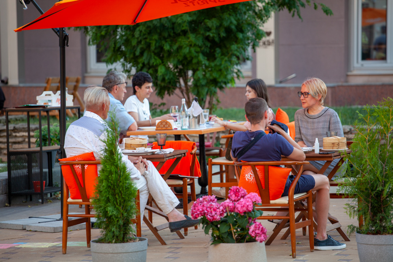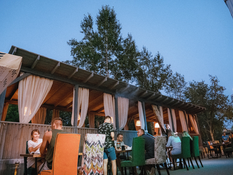 Веранда органического винного бара под черными зонтами впервые начала принимать гостей 1 июля, постепенно обрастая диванами и красивой мебелью. Сомелье бара Тимур Саулебаев и Сергей Черепанов уже запаслись вином, а шеф-повар Ражабали Яров подготовил паназиатское меню с суши, роллами и новыми десертами.