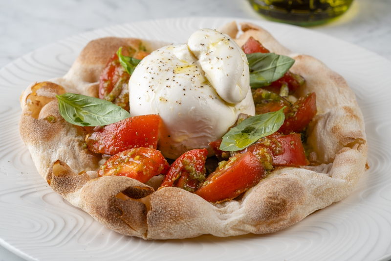 Буррата с томатами и базиликом на хрустящей пинцони – 750 рублей