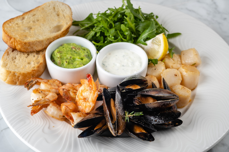 Зеленый салат с авокадо, фарерским лососем и яйцом пашот – 550 рублей Вафли с тигровыми креветками, авомуссом и легким салатом – 430 рублей Малая кастрюлька мидий в томатном соусе – 490 рублей