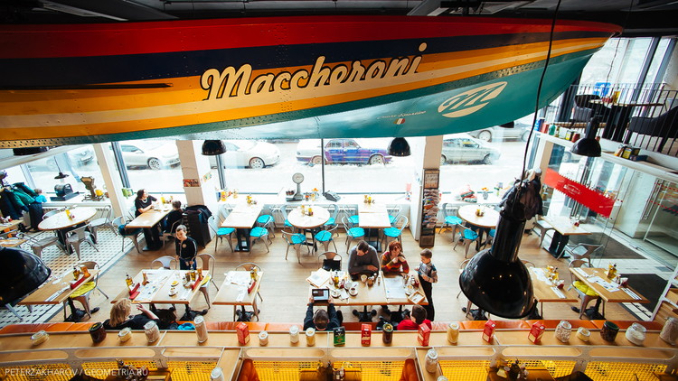 бабушек, но в то же время, здесь приятно окунуться в мягкий уют 1960-х, усевшись на диване, воткнув гаджет в розетку и смотреть в огромные окна на мегаполис. Снующие официанты, выкрикивающие так ласкающие ухо россиянина сладкие итальянские паста-пицца-ризотто, и повара на открытой кухне. Современное оборудование оттеняют старые мясорубки и кастрюльки из прошлого века – милые атмосферные детали декора. Погружаешься и думаешь, где ты? Милан? Нью-Йорк? Лондон? Маккерони стирает границы восприятия – кажется, здесь внутри ты центр вселенной. А снаружи – ты странник в пустыне, увидевший сквозь панорамные окна ресторана вожделенный оазис. Оазис в ритме мегаполиса. Оазис настоящей Италии.