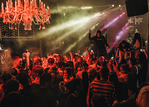 Комфортное расположение зон заведения, позволяет Вам находиться как в гуще событий на танцполе и возле сцены, так и возле своих столов на одном из двух балконов