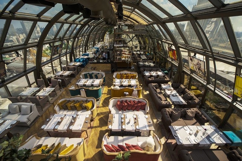 Мы гордимся впечатляющей панорамой Москвы – вы сами можете выбирать вид, которым будете любоваться в течение всего вечера: отсвечивающие золотом купола Храма Христа Спасителя, массивное здание МИД, гостиница «Украина», Новый Арбат, Садовое Кольцо, международный деловой центр «Москва Сити» и набережные Москвы-реки.