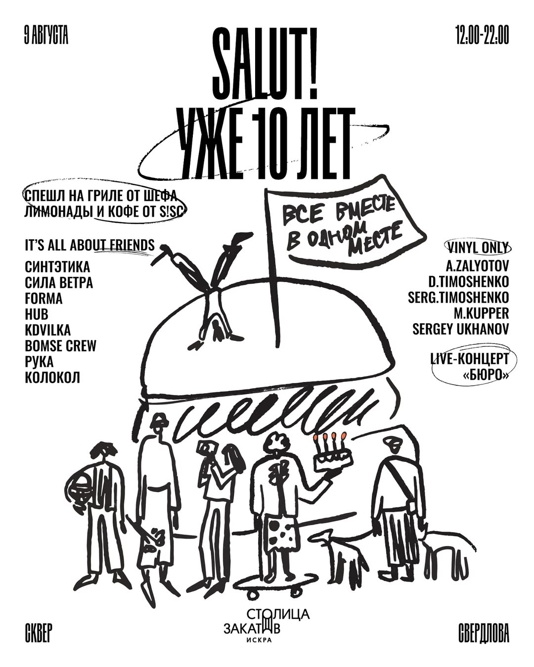 Салют отмечает так, как умеет лучше всего: собирает вместе всех, кто сделал эти годы особенными, и всё, что мы так любим — культовые бургеры, живую музыку и дружное комьюнити. В программе дня и вечера: