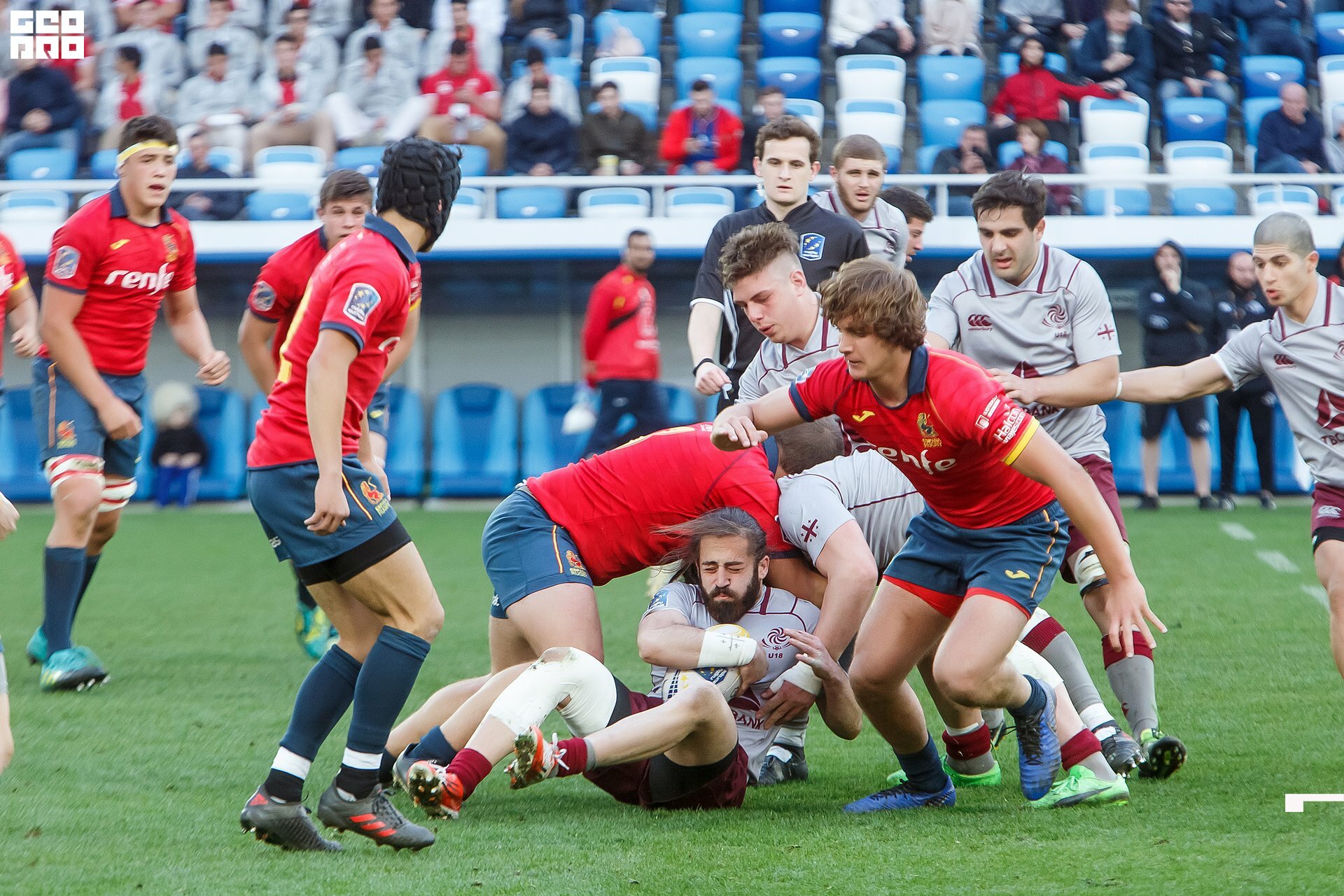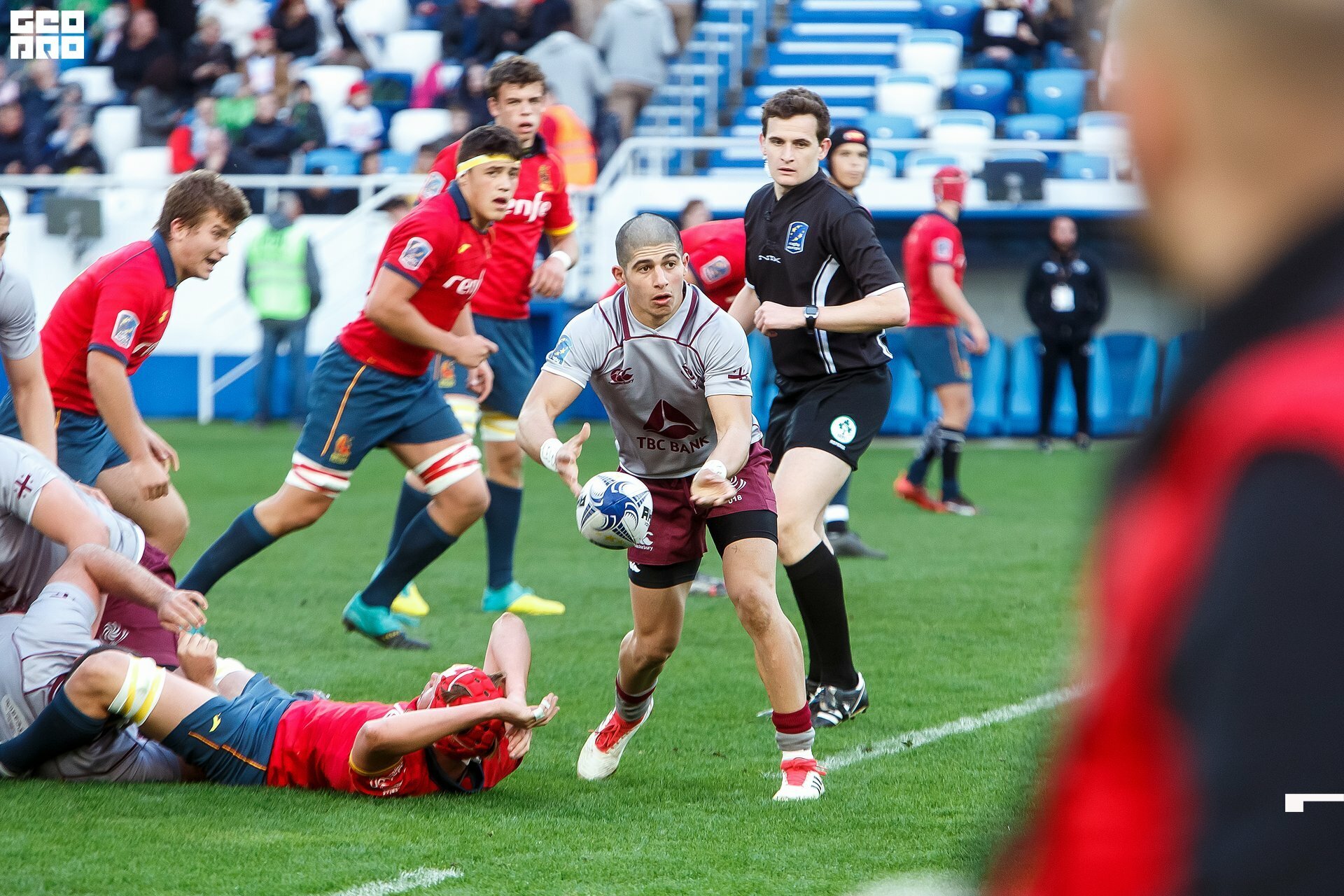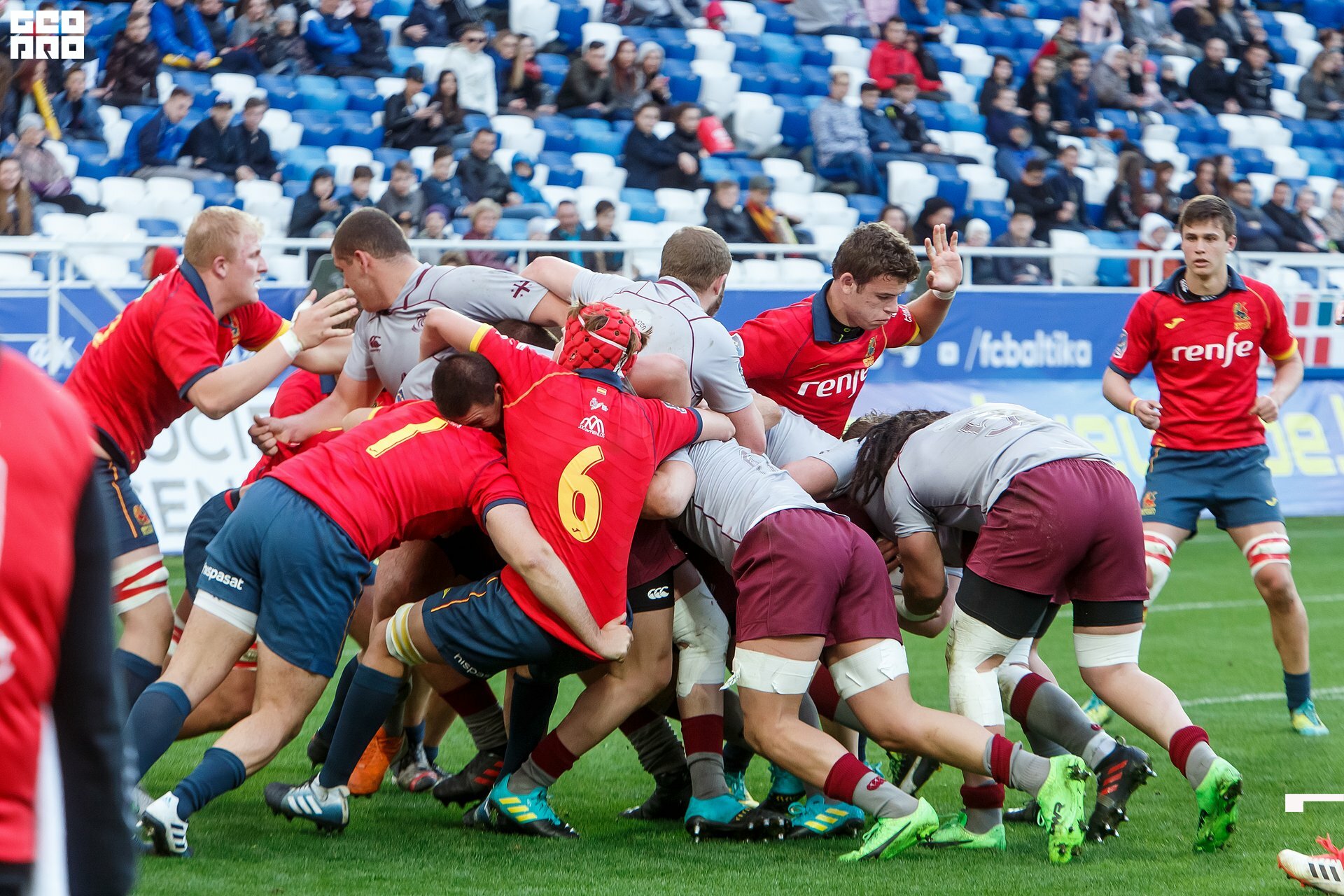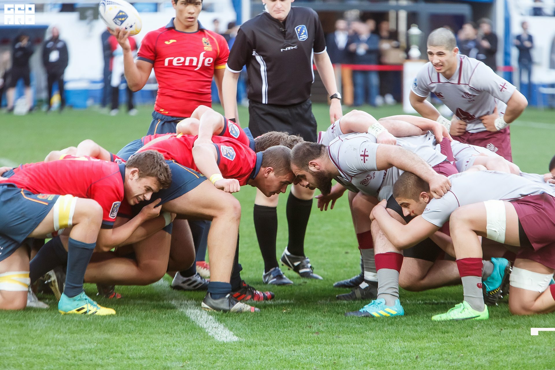Second and final game of the day was set to become a record-breaker. Witnessed by an astounding 9700 spectators, the match turned out to be the most attended in history of U18 Rugby Championships. Almost ten thousand people including the President of Rugby Europe Octavian Morariu and the Govenor of Kaliningrad Region Anton Alikhanov saw the team of Georgia defeating Spain in a hard but rewarding battle (20:10).