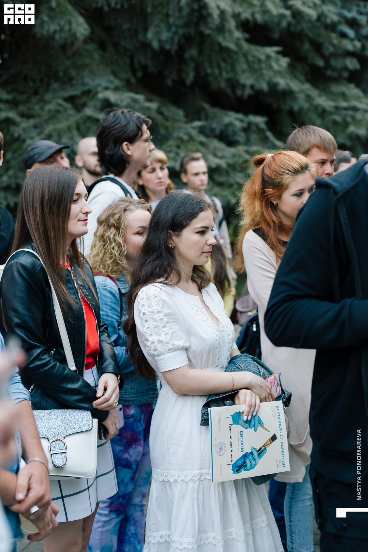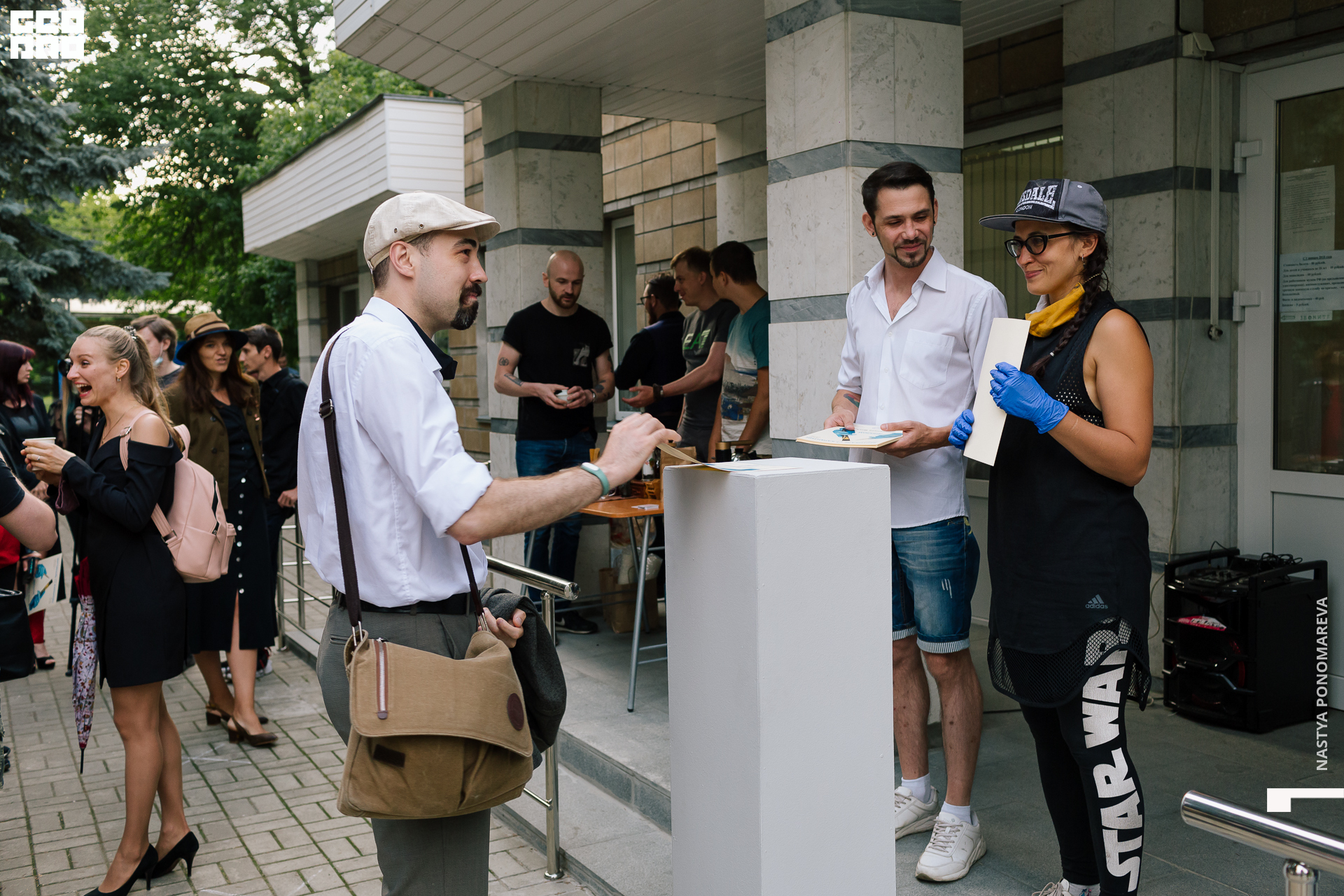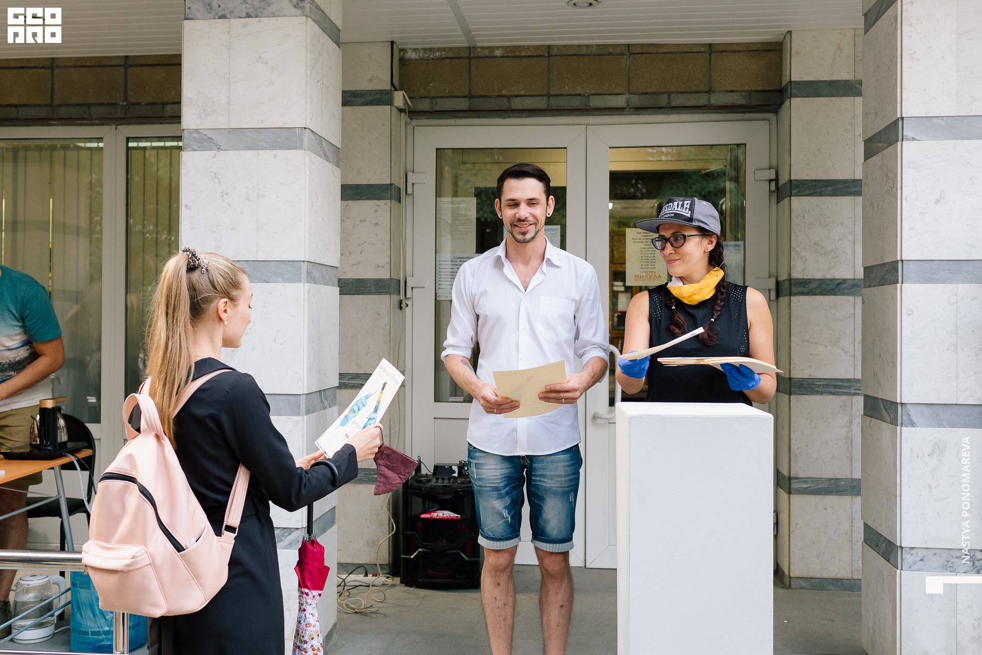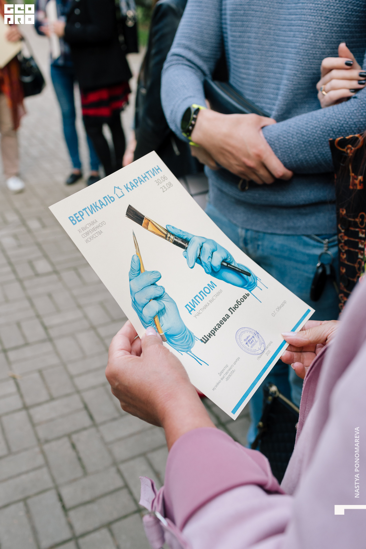 Очная встреча с художниками, участниками выставки «Вертикаль», состоялась на крыльце музея, асфальт площади Героев был размечен, чтобы все присутствующие могли находится на безопасной дистанции друг от друга. Мы все оказались в ситуации дефицита искусства и в рамках перфоманса все стали частью живой очереди из тех, кто хочет посмотреть на искусство и преодолевает для этого препятствия. Группы по 5 человек заходили в музей на 10 минут. Маски и перчатки — обязательный дресс-код этого мероприятия.
