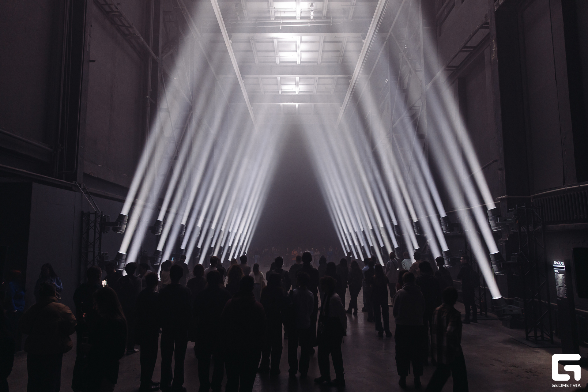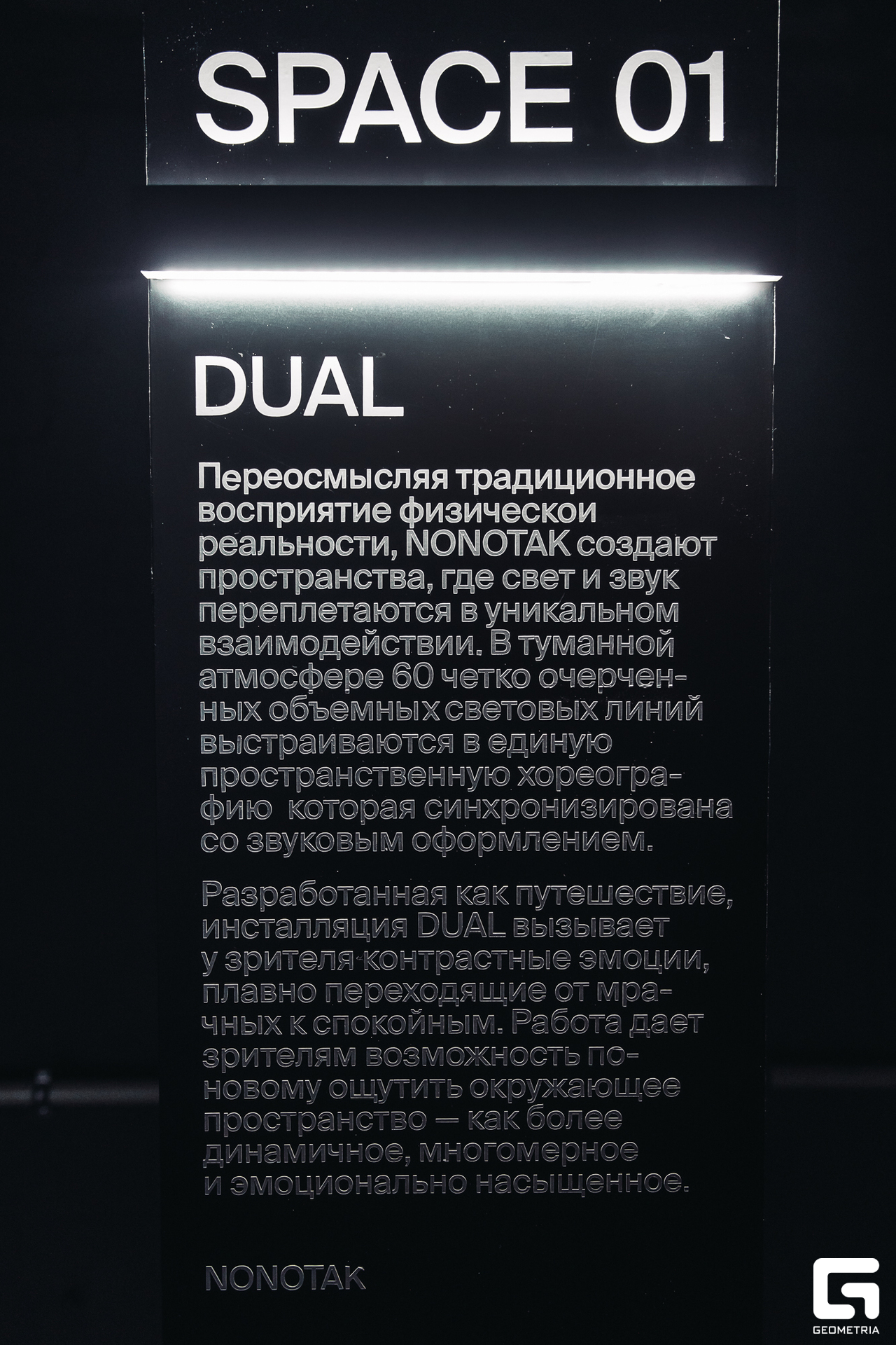 DUAL — в туманной атмосфере 60 четко очерченных объемных световых линий создают единую пространственную хореографию, которая точно синхронизирована с звуковым оформлением. Разработанная как путешествие, инсталляция вызывает разнообразие контрастных эмоций, плавно переходя от темных моментов к ощущению спокойствия.