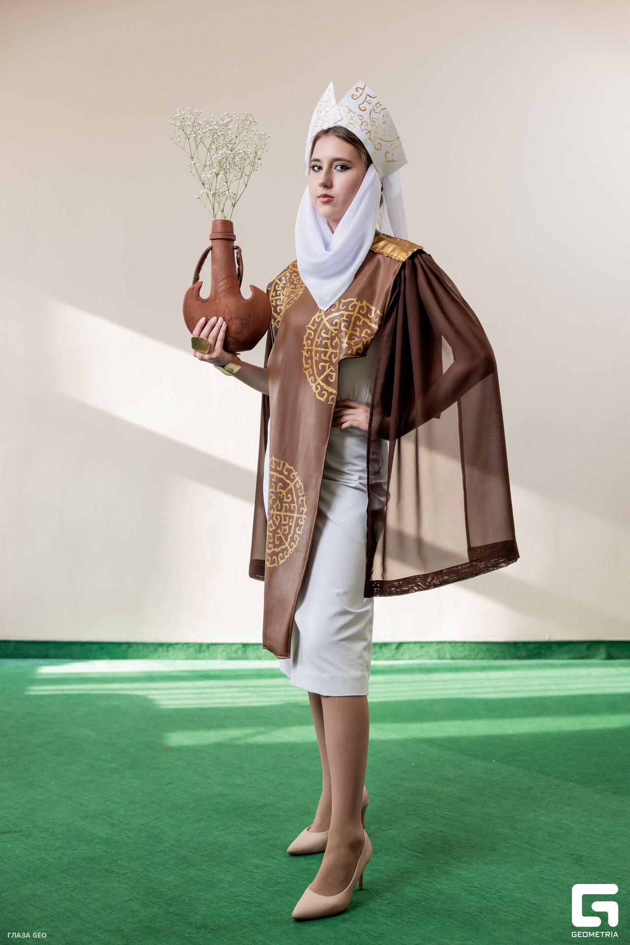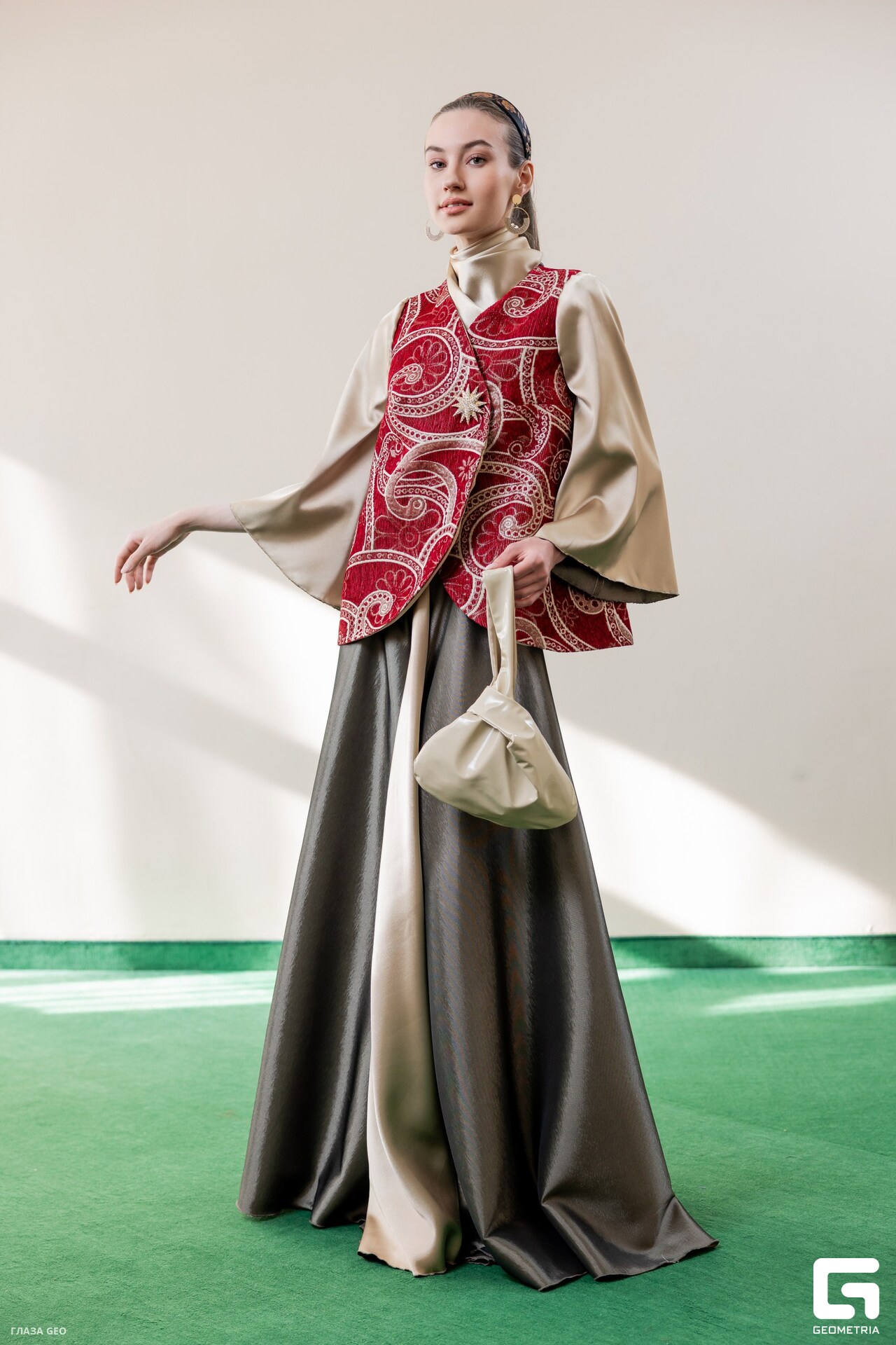 Дизайнер Марина Кильдеева. Коллекция «Глоток потока». Источник вдохновения – глиняный сосуд для кумыса – кыргизстанский коакор. Форма коллекции – трапеция – стилизованная форма самого коакора, форма гор. Рисунки на тканях – обережные орнаменты. Образы коллекции – это подключение к потоку природной силы и свободы.