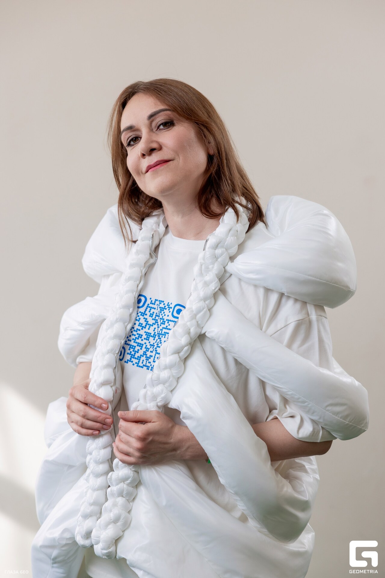 Дизайнер Яна Михина. Коллекция «Облачная Земля». Линии в одежде повторяют лепестки гжельской розы, бело-голубая гамма как бескрайнее небо с облаками. Остов этого мира – основа будущей легкости и честности с самим собой.