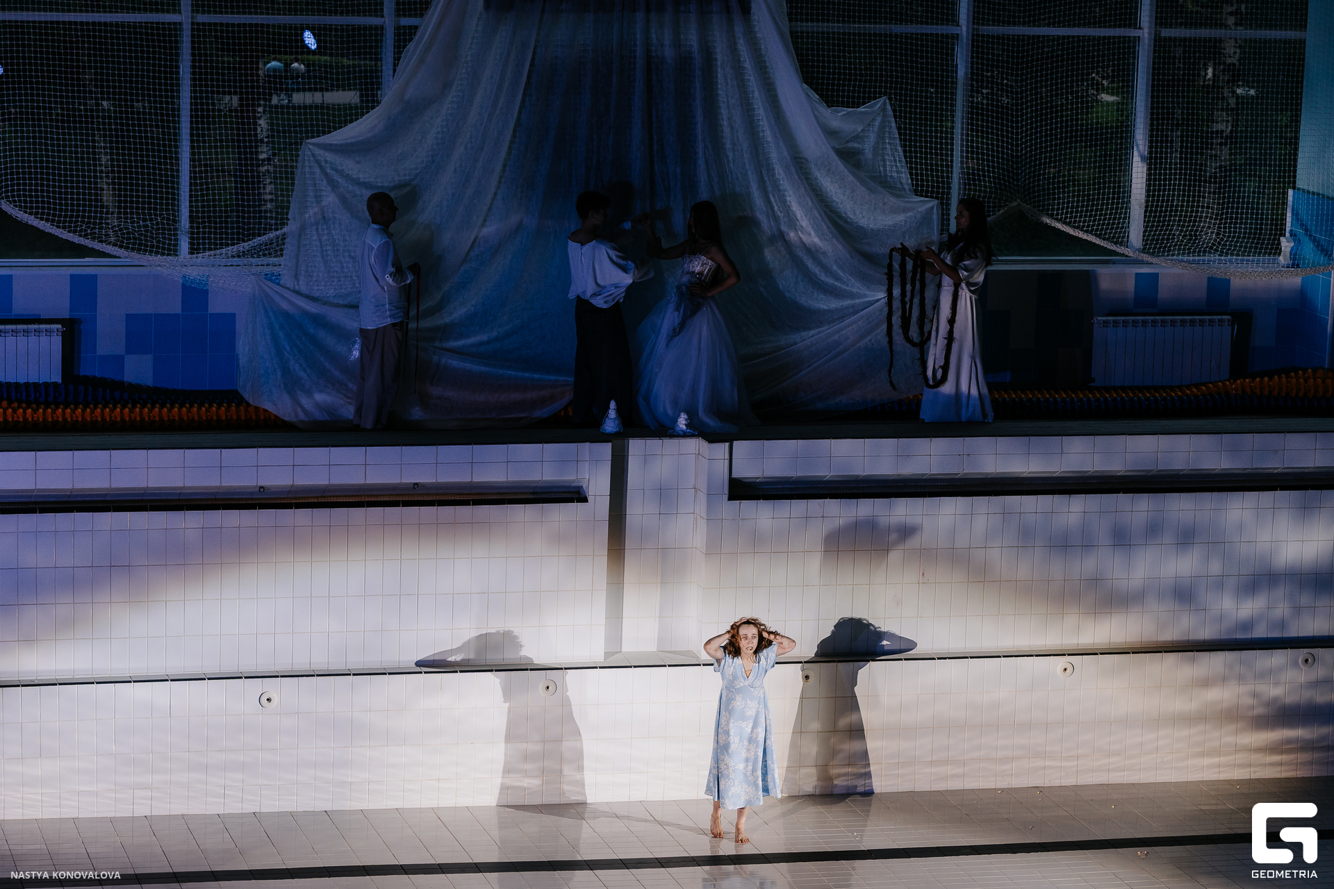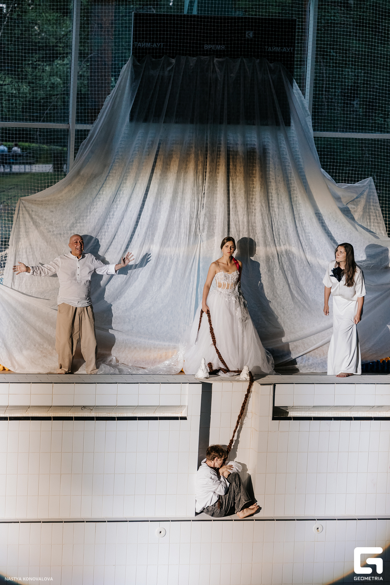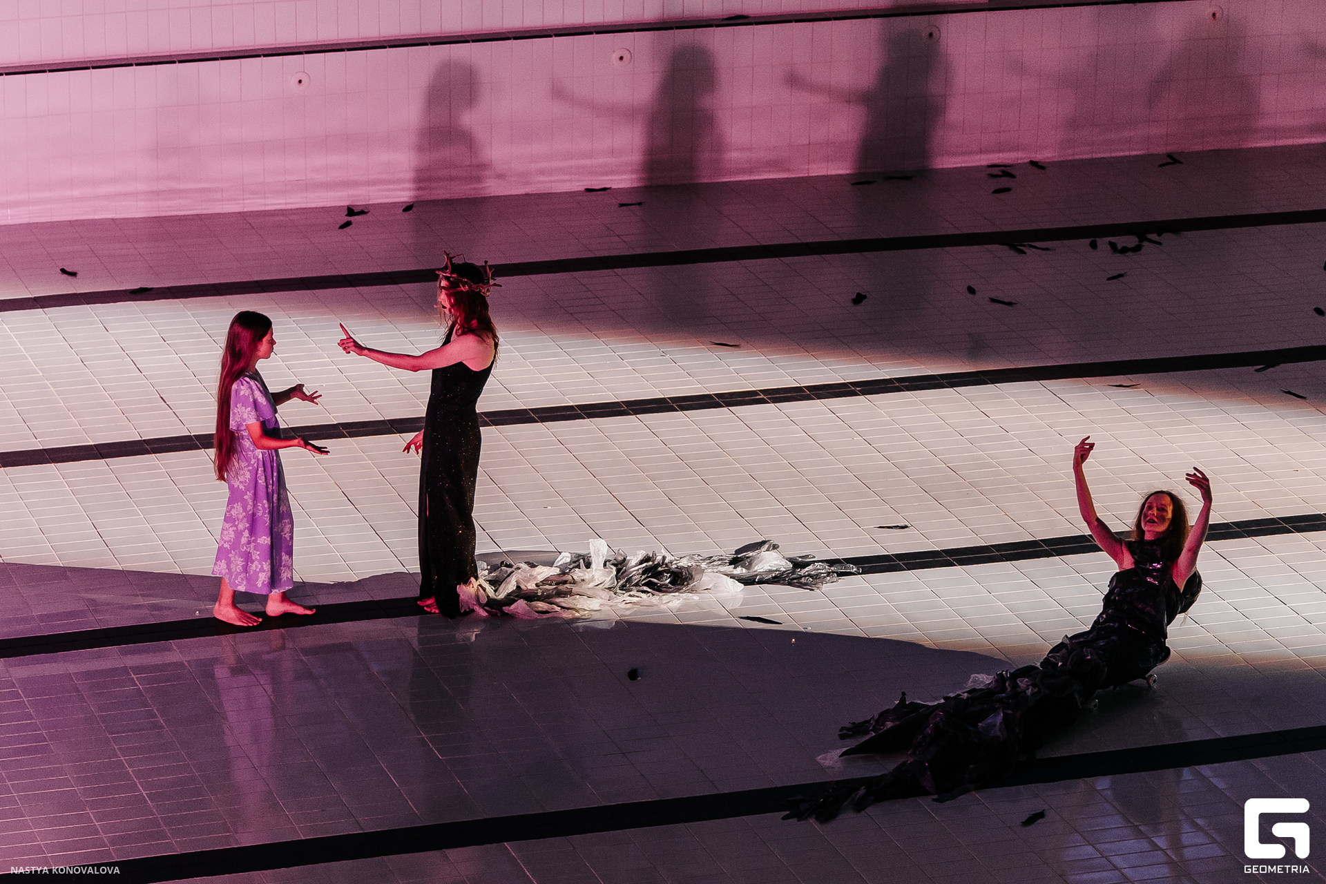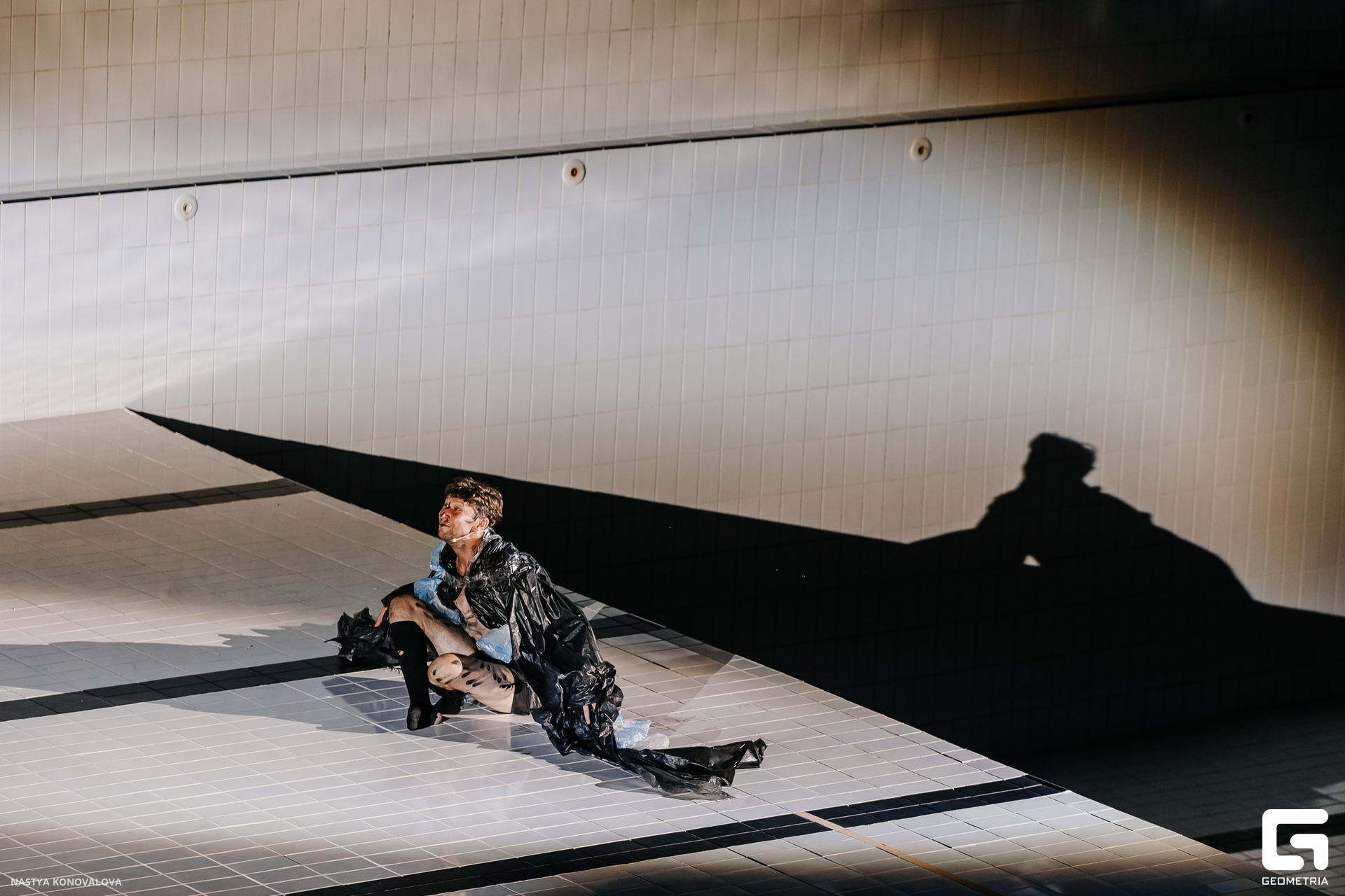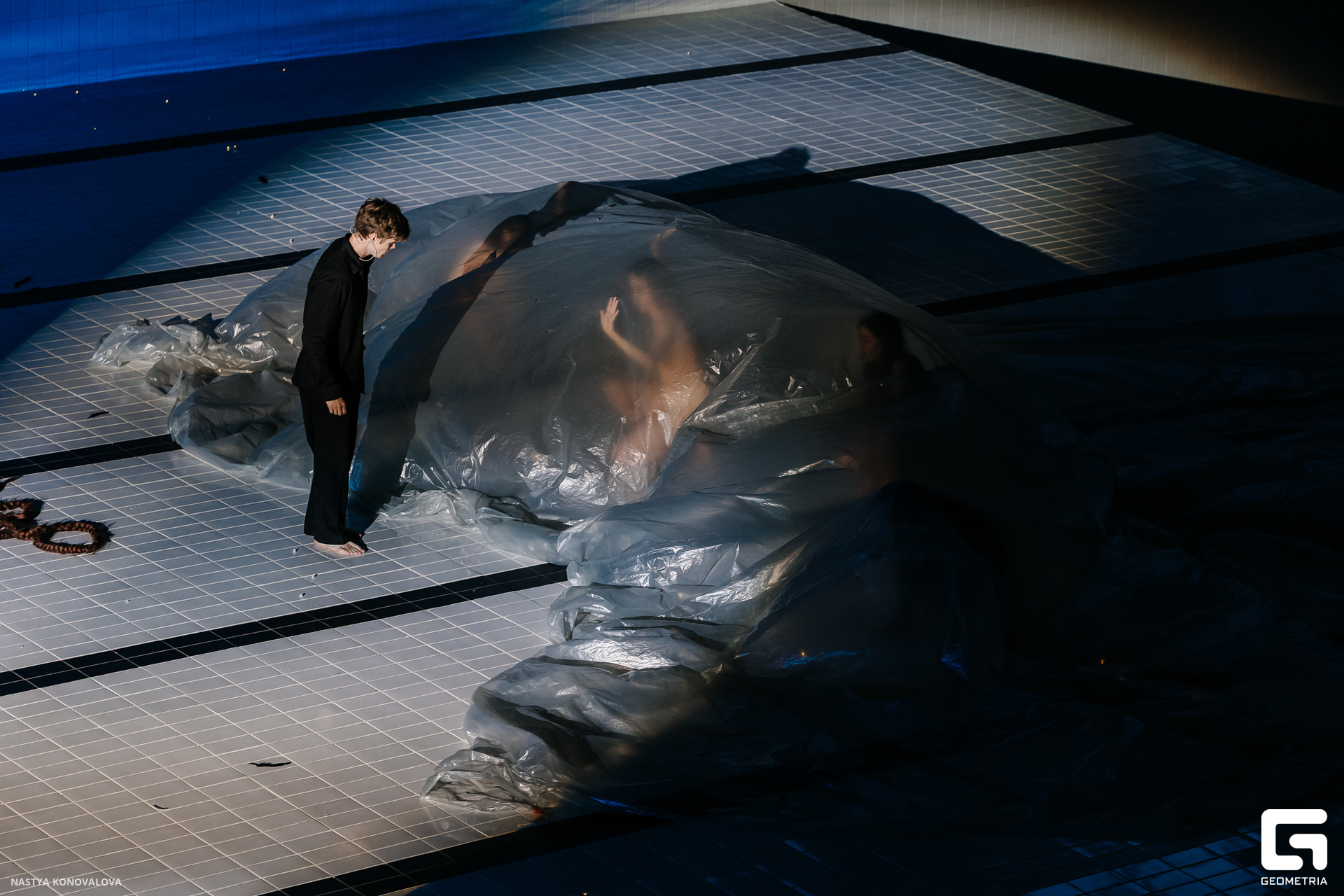 В спектакле Екатерины Половцевой пустой бассейн, ожидающий наполнения, — как омут сомнений, из которых невозможно выбраться. Постоянное ожидание избавления от тревог, самоистязания, чувство вины, надежда на то, что крепко запутанный клубок предательств разрешится и настанет счастливое, спокойное, безмятежное время. Но в этом ожидании жизнь замирает, гниёт и человек превращается в собственную тень.