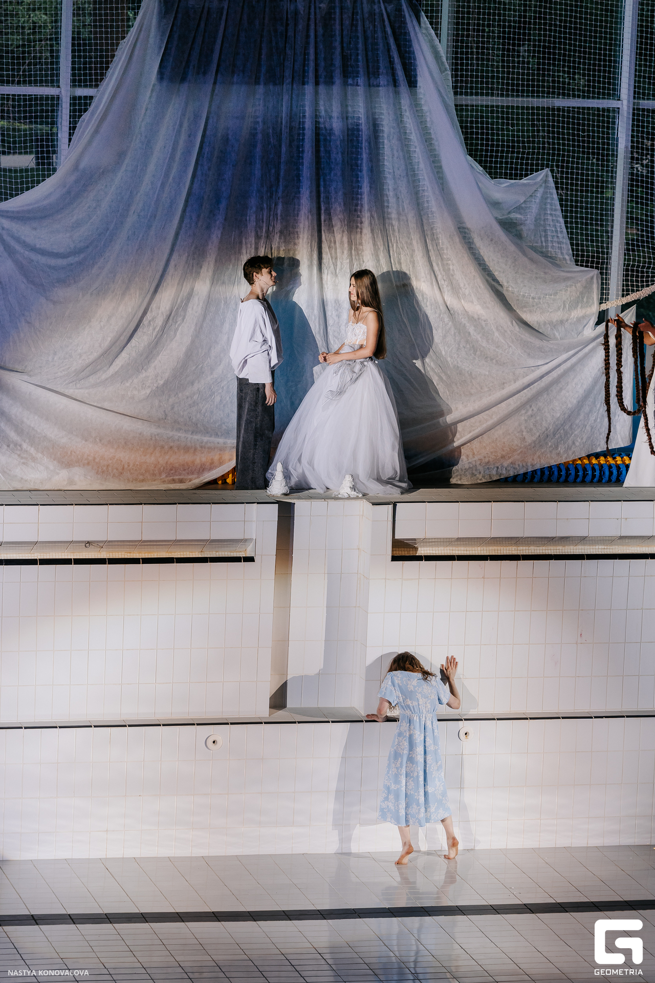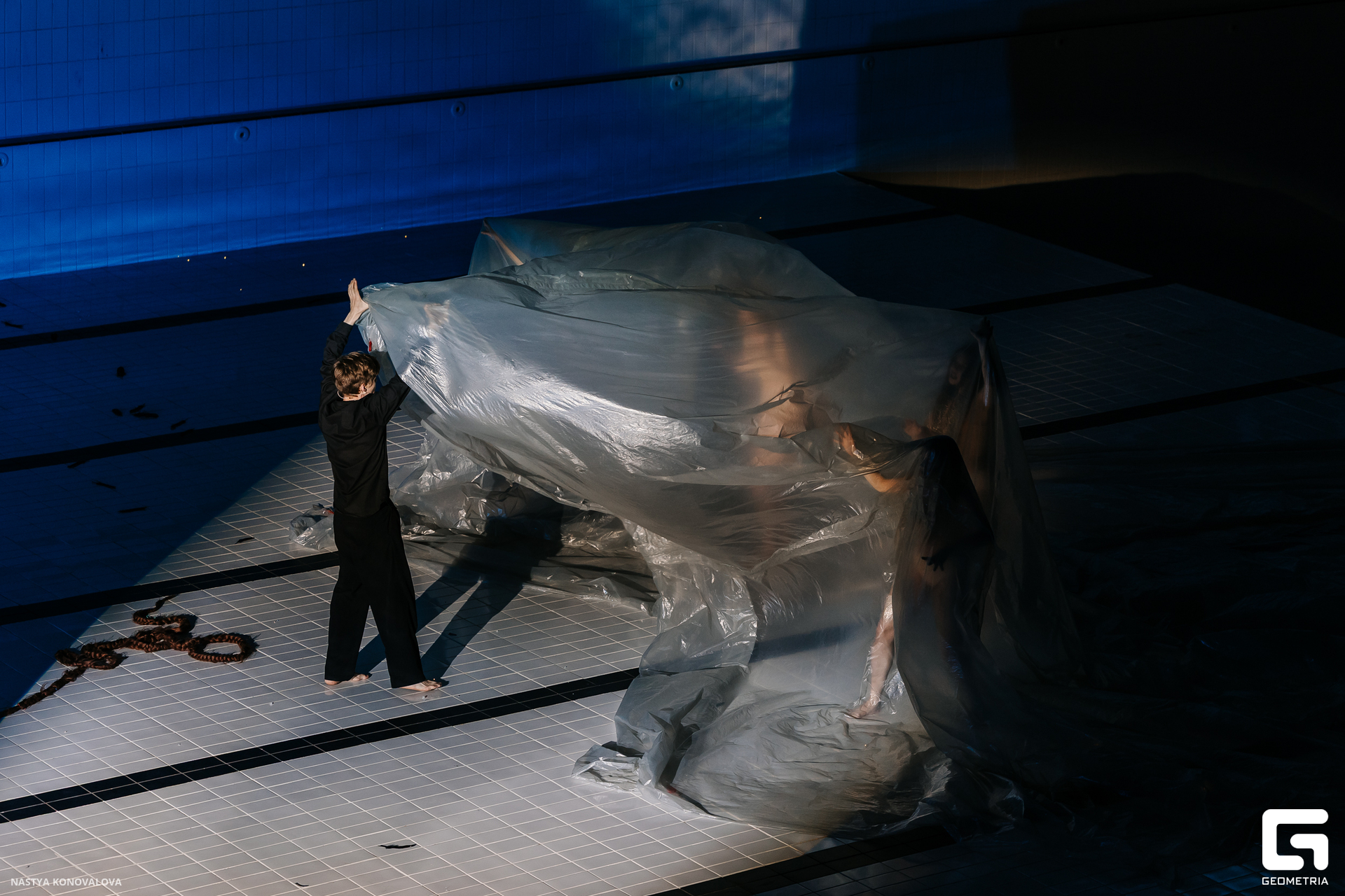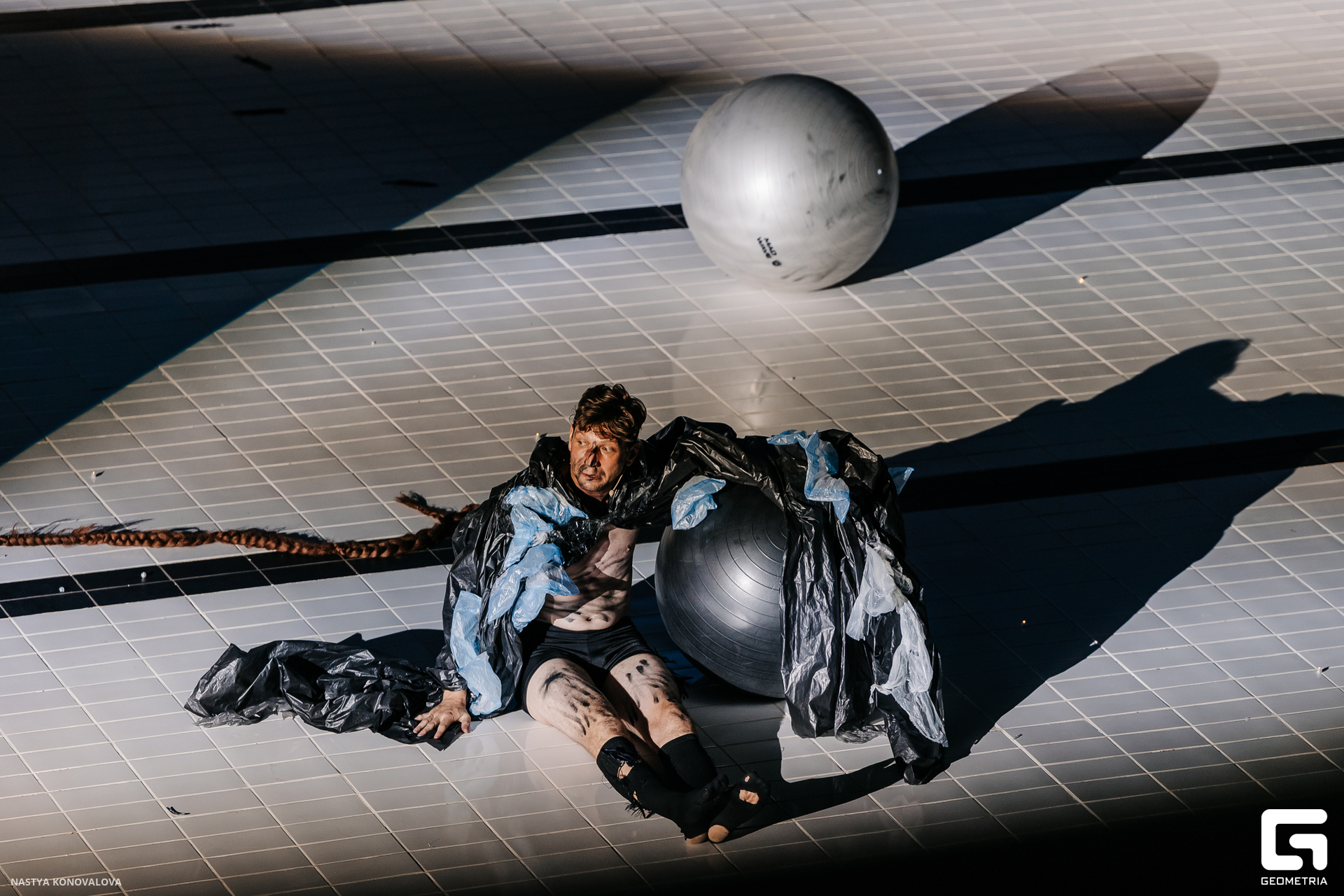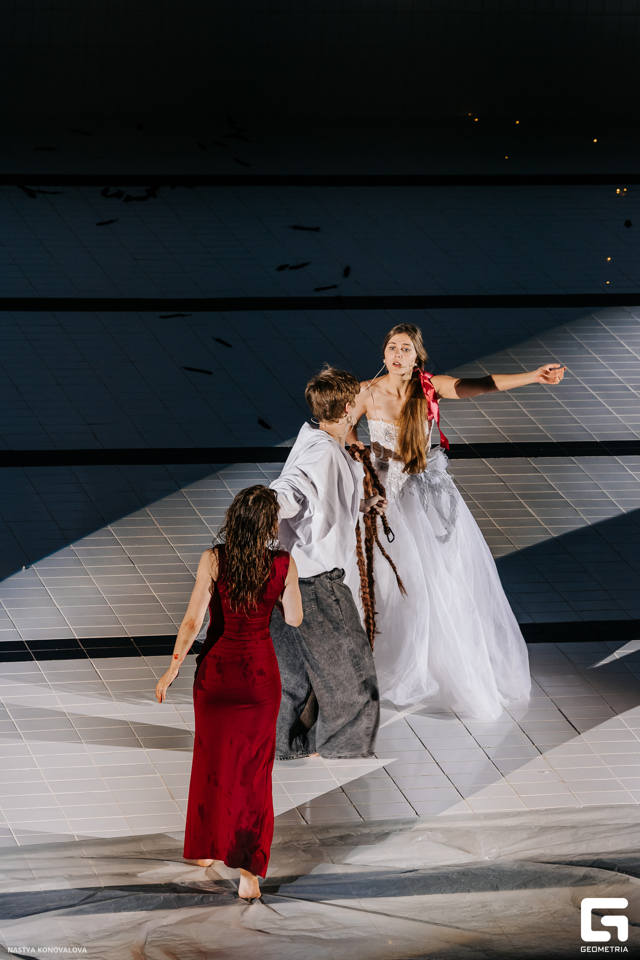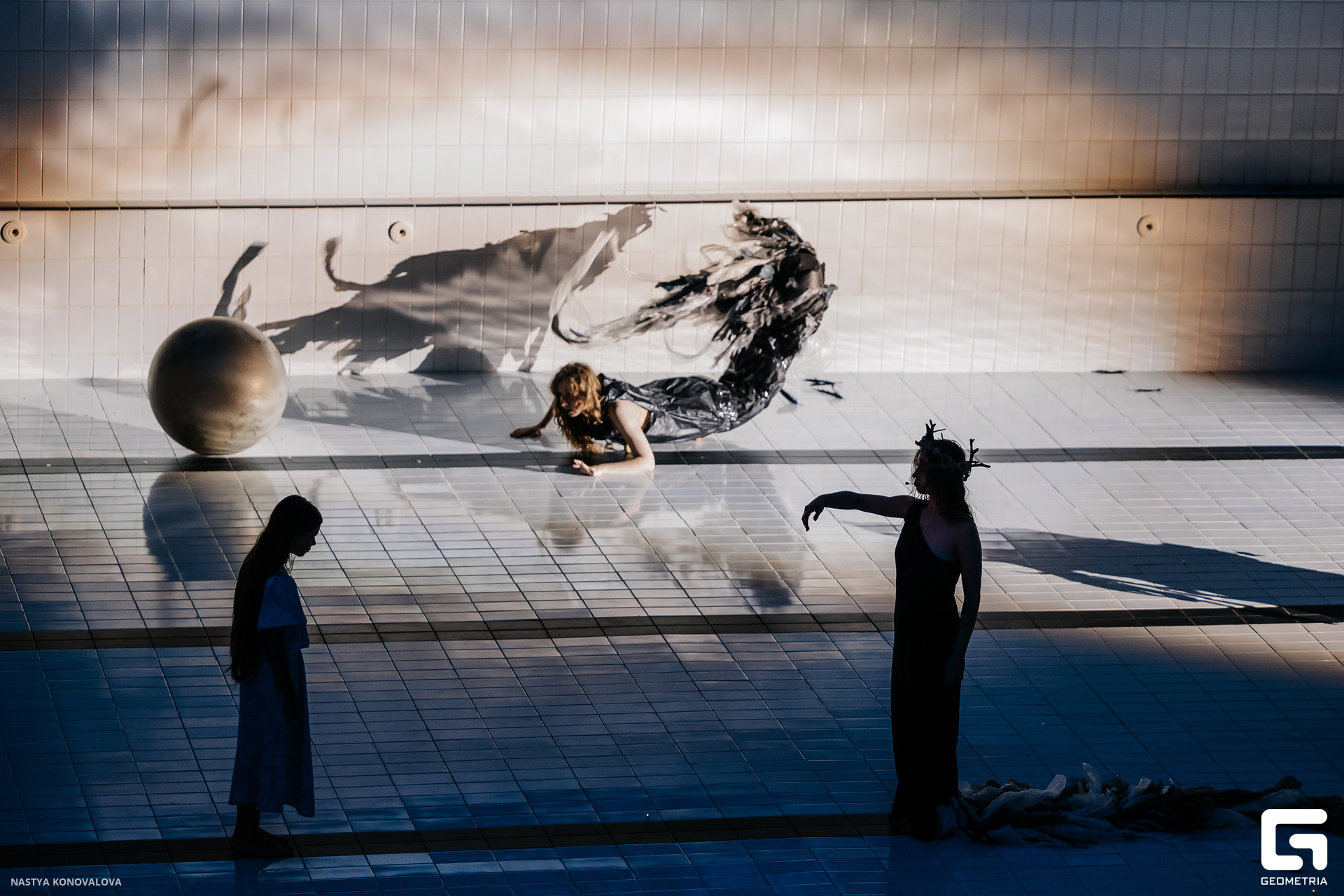 В спектакле Екатерины Половцевой пустой бассейн, ожидающий наполнения, — как омут сомнений, из которых невозможно выбраться. Постоянное ожидание избавления от тревог, самоистязания, чувство вины, надежда на то, что крепко запутанный клубок предательств разрешится и настанет счастливое, спокойное, безмятежное время. Но в этом ожидании жизнь замирает, гниёт и человек превращается в собственную тень.