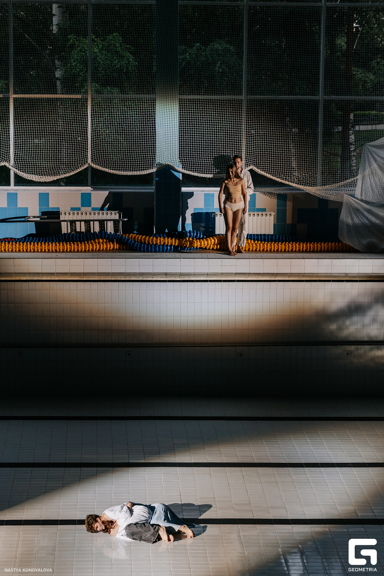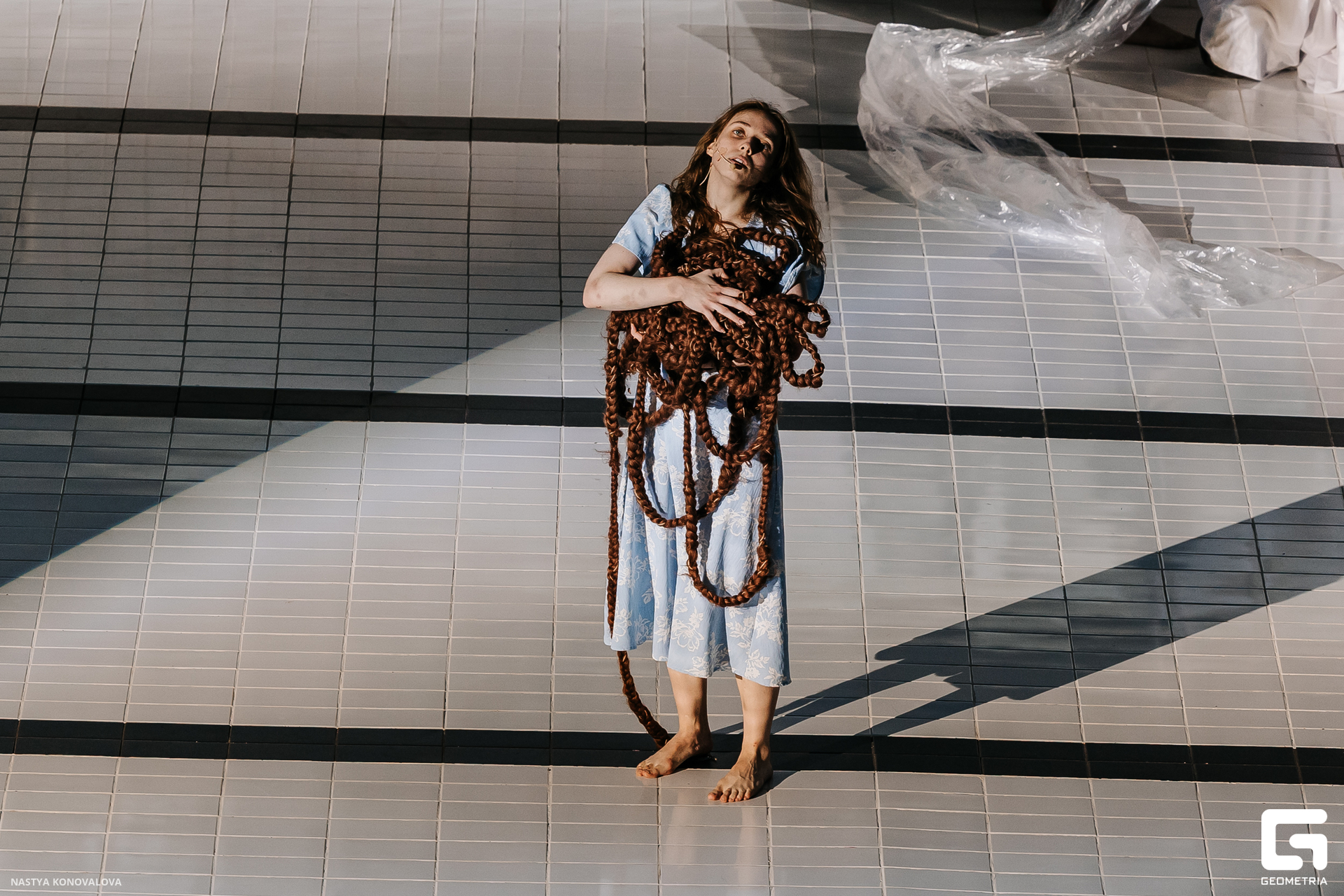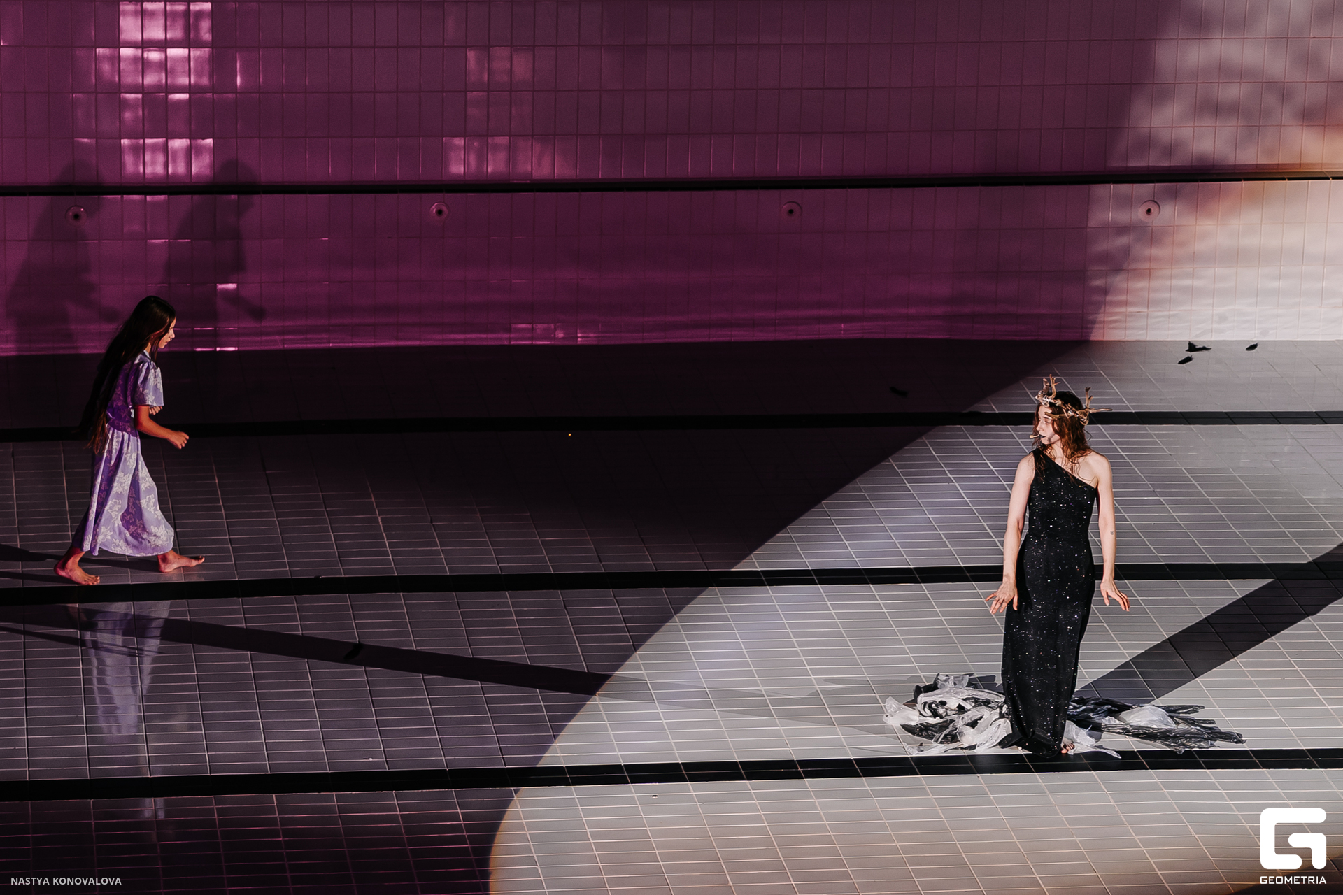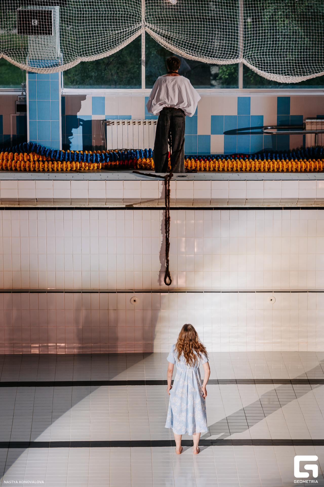 В спектакле Екатерины Половцевой пустой бассейн, ожидающий наполнения, — как омут сомнений, из которых невозможно выбраться. Постоянное ожидание избавления от тревог, самоистязания, чувство вины, надежда на то, что крепко запутанный клубок предательств разрешится и настанет счастливое, спокойное, безмятежное время. Но в этом ожидании жизнь замирает, гниёт и человек превращается в собственную тень.