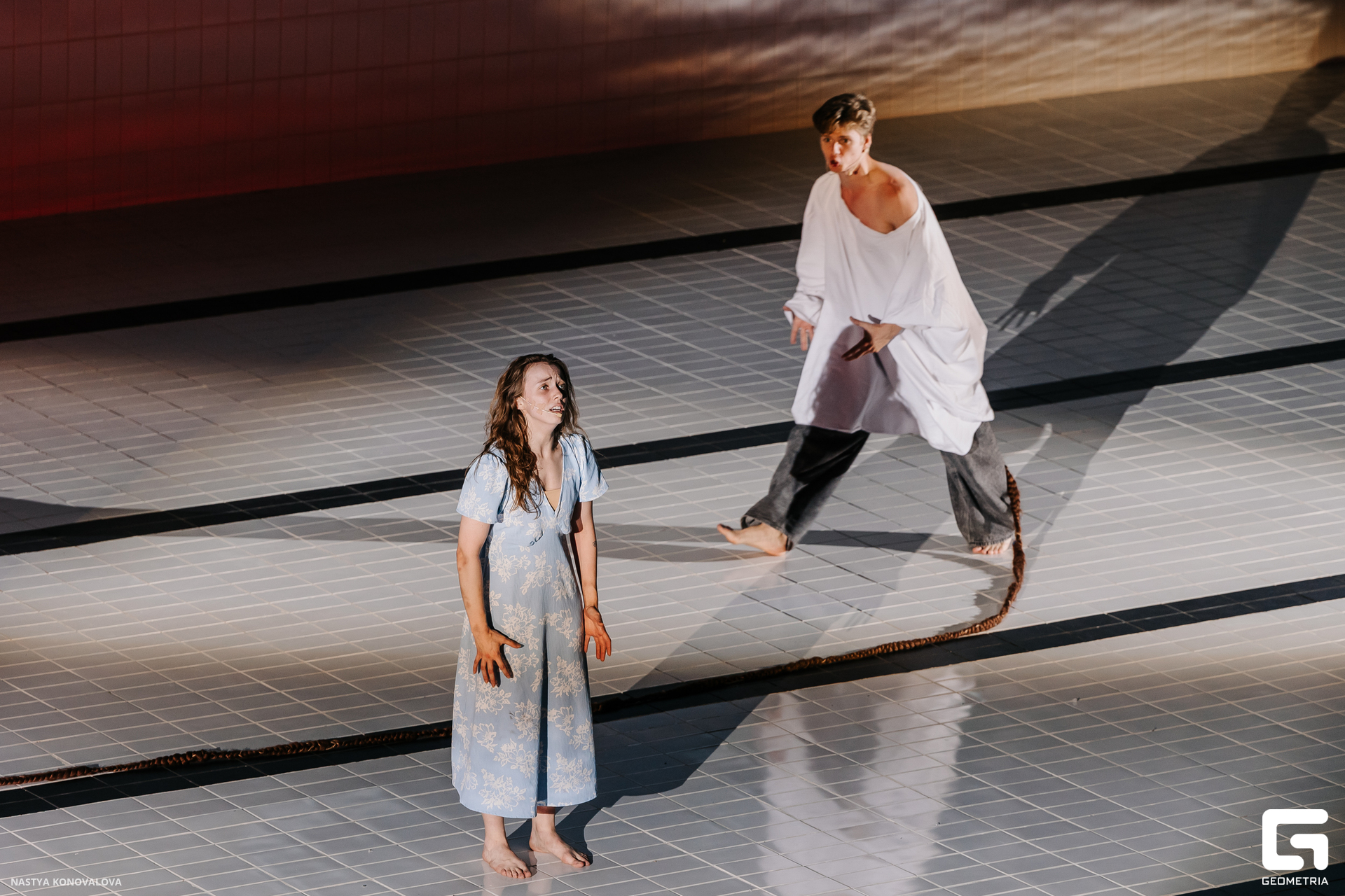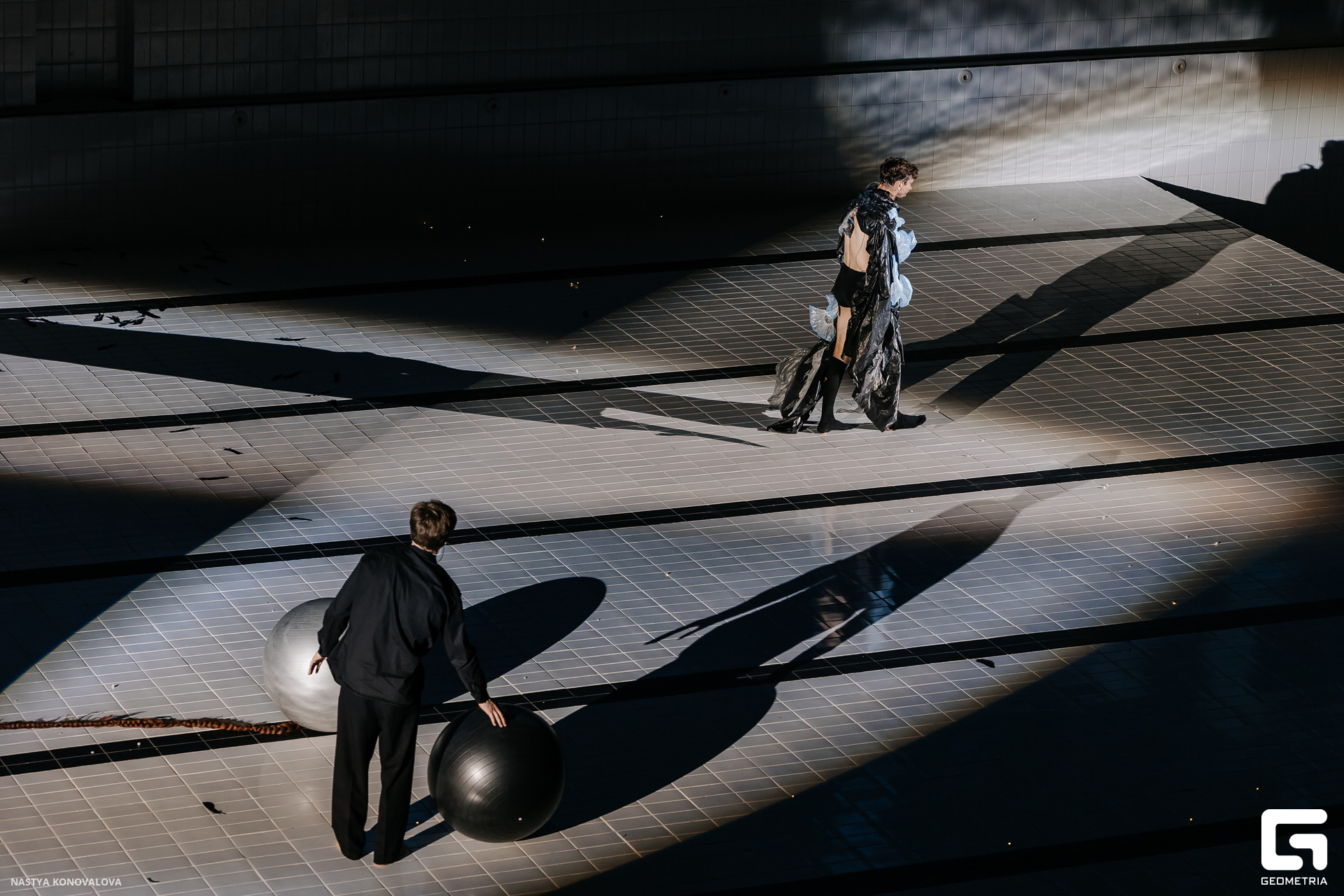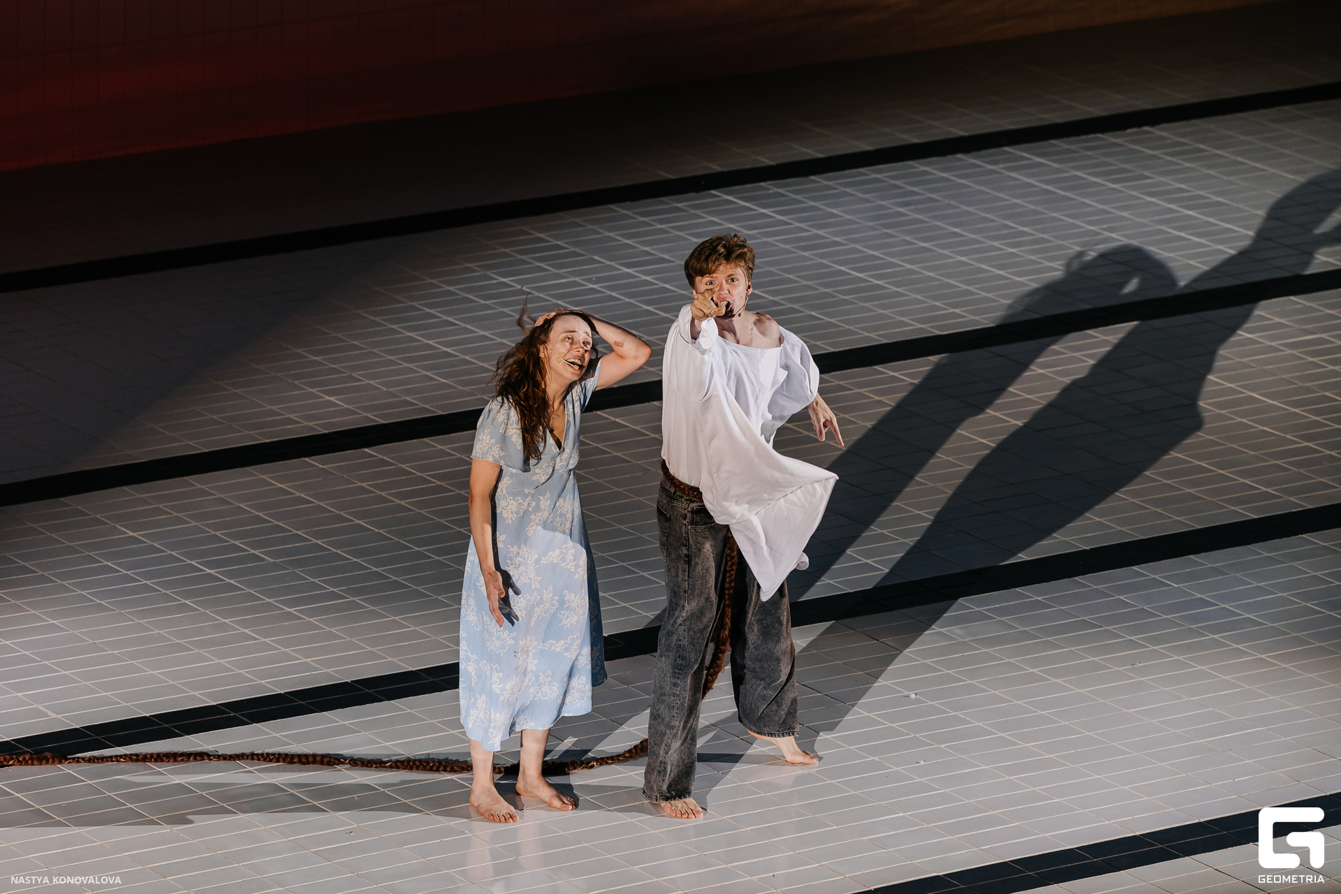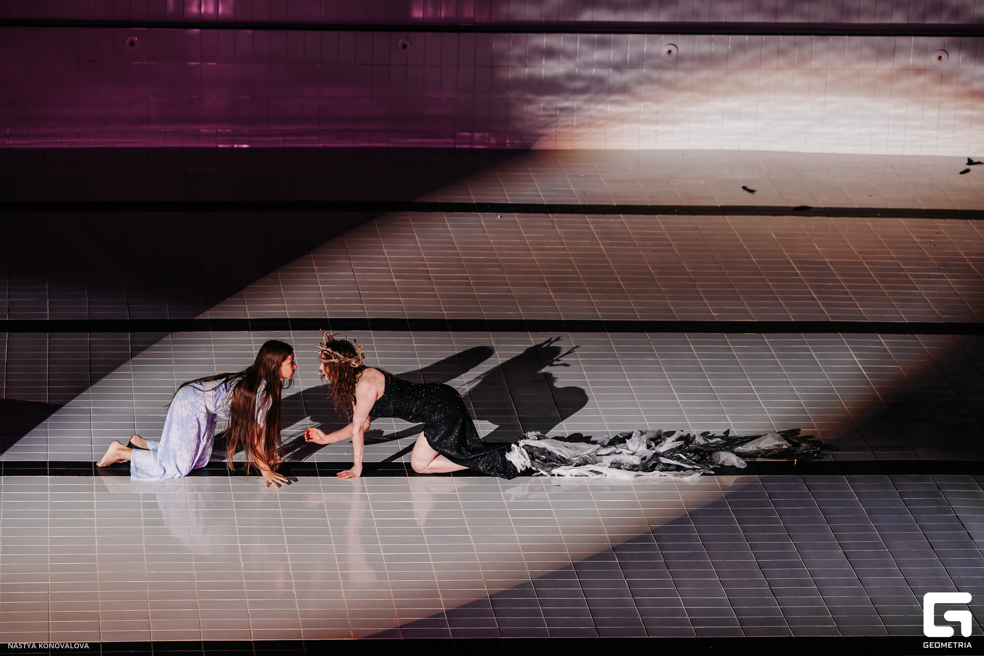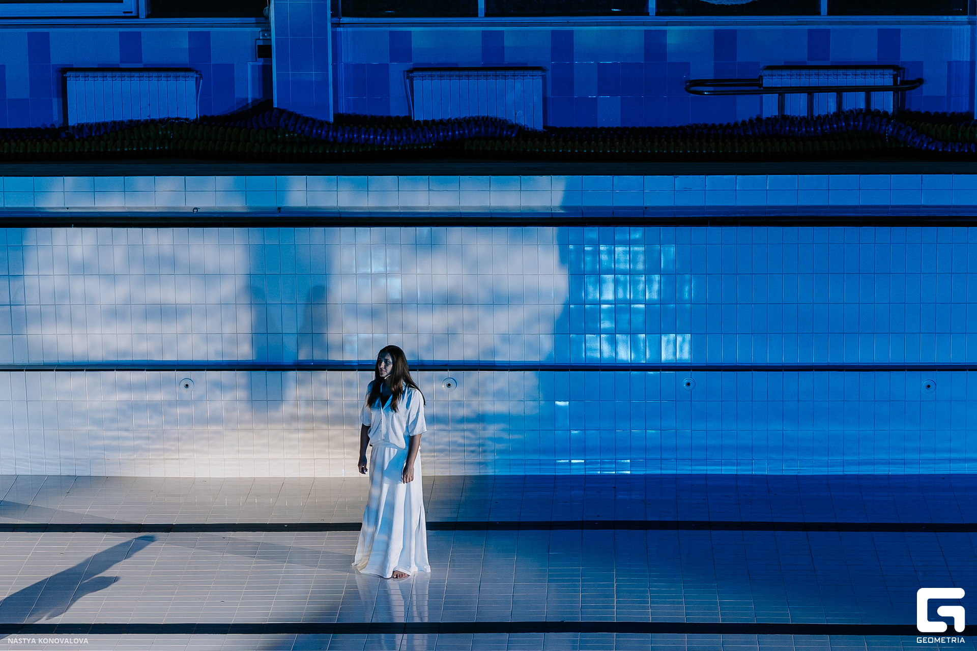 В спектакле Екатерины Половцевой пустой бассейн, ожидающий наполнения, — как омут сомнений, из которых невозможно выбраться. Постоянное ожидание избавления от тревог, самоистязания, чувство вины, надежда на то, что крепко запутанный клубок предательств разрешится и настанет счастливое, спокойное, безмятежное время. Но в этом ожидании жизнь замирает, гниёт и человек превращается в собственную тень.
