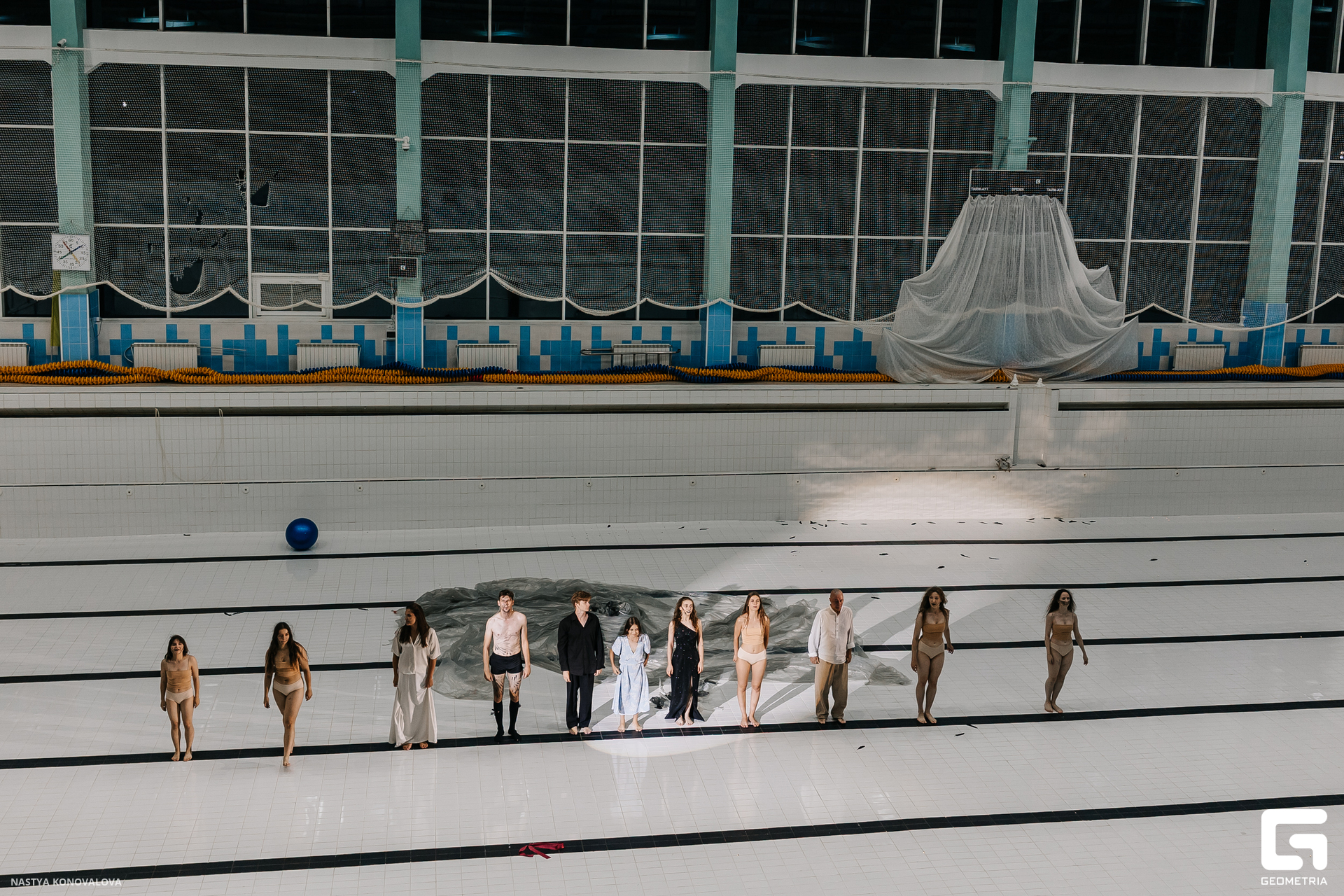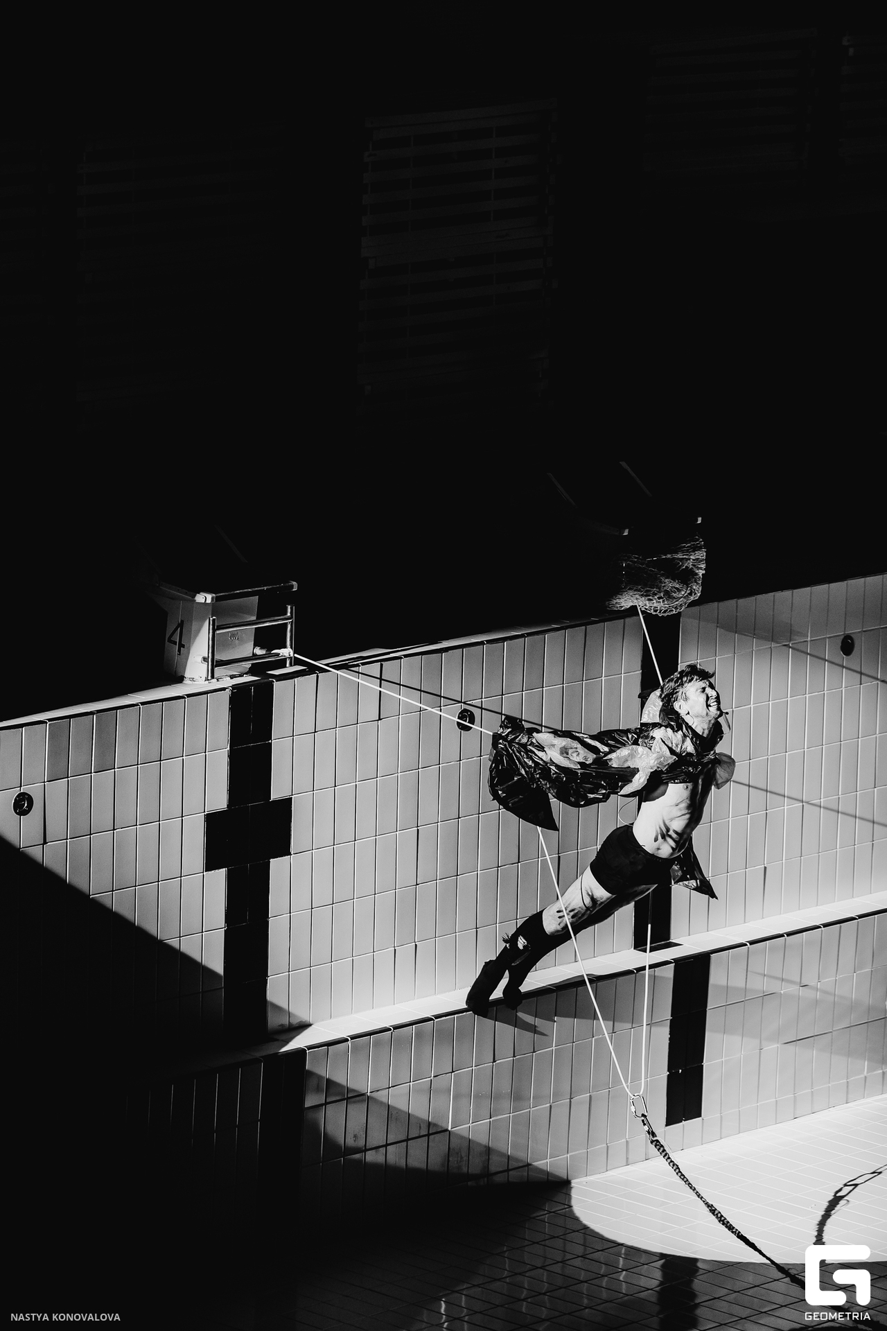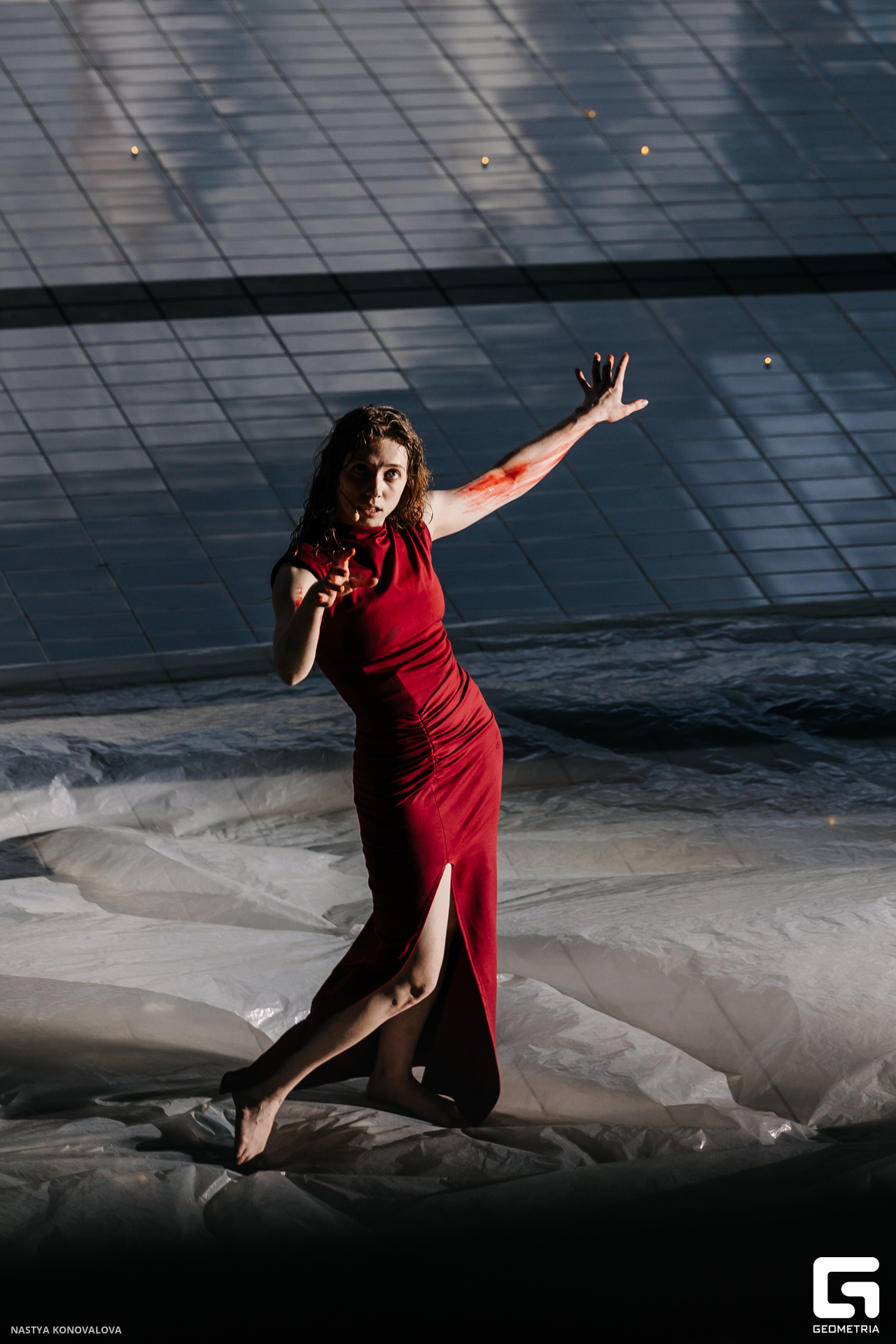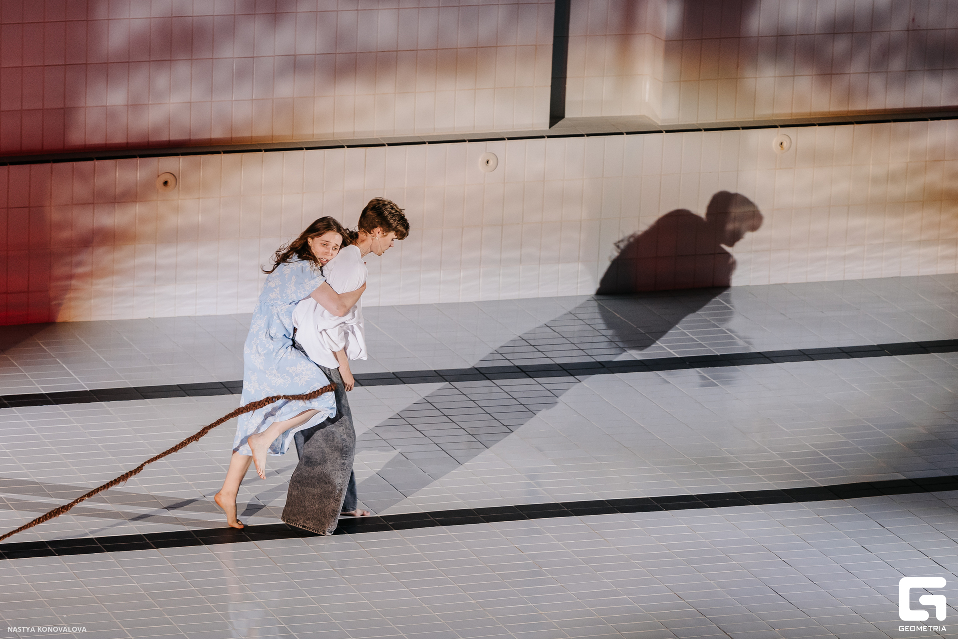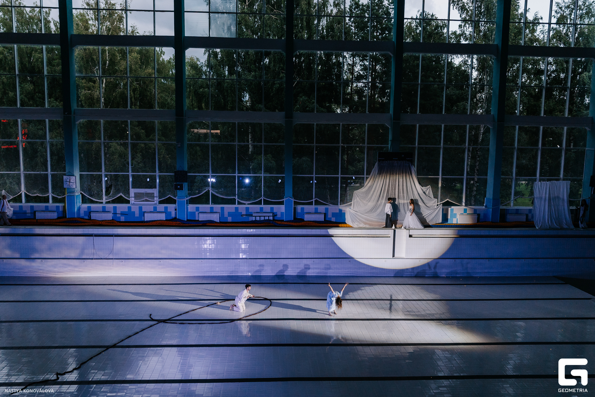 В спектакле Екатерины Половцевой пустой бассейн, ожидающий наполнения, — как омут сомнений, из которых невозможно выбраться. Постоянное ожидание избавления от тревог, самоистязания, чувство вины, надежда на то, что крепко запутанный клубок предательств разрешится и настанет счастливое, спокойное, безмятежное время. Но в этом ожидании жизнь замирает, гниёт и человек превращается в собственную тень.