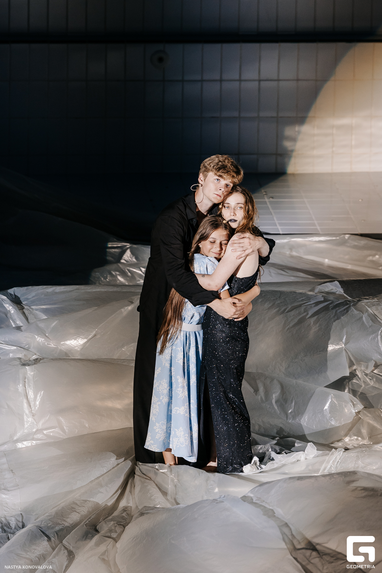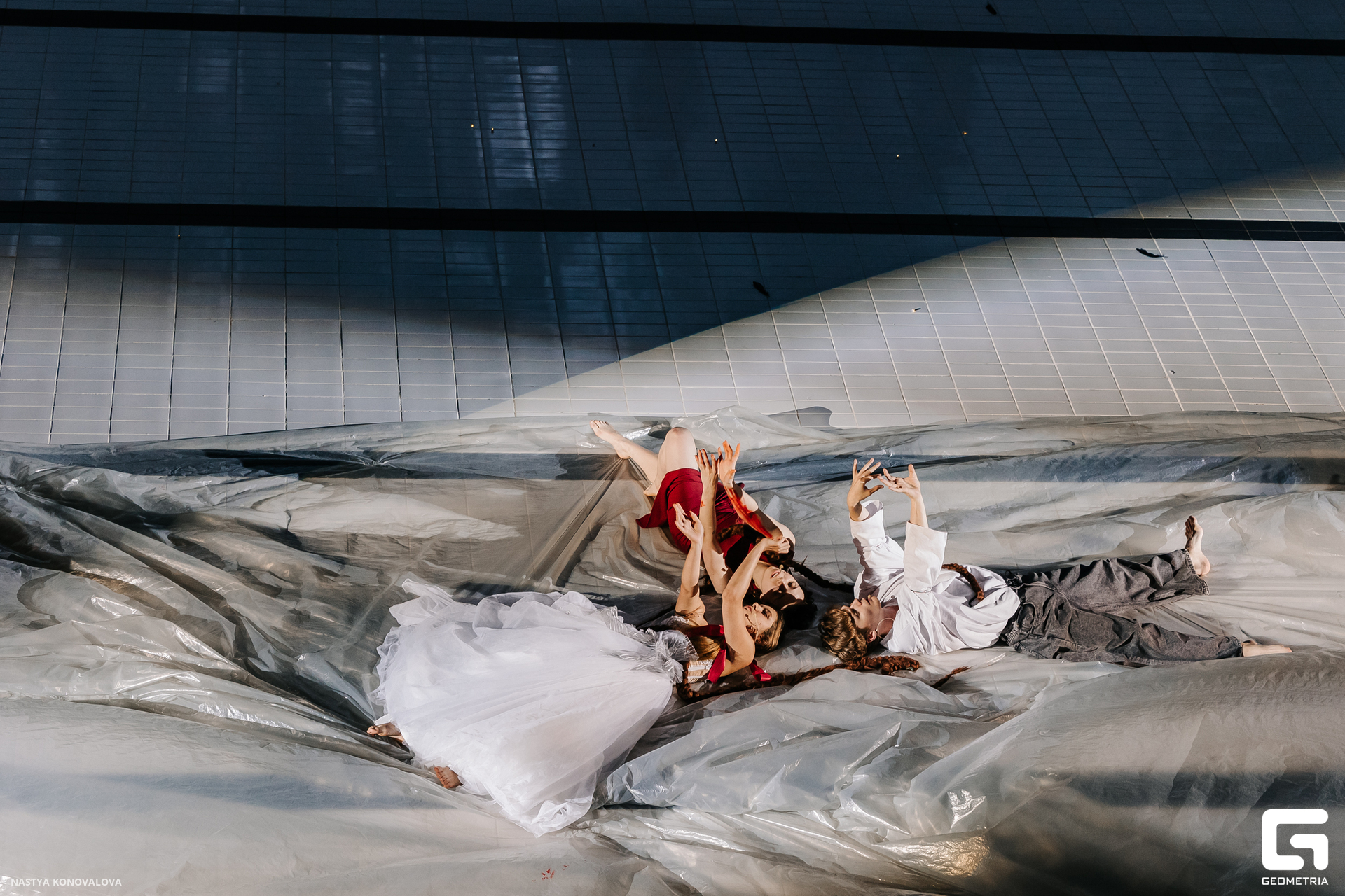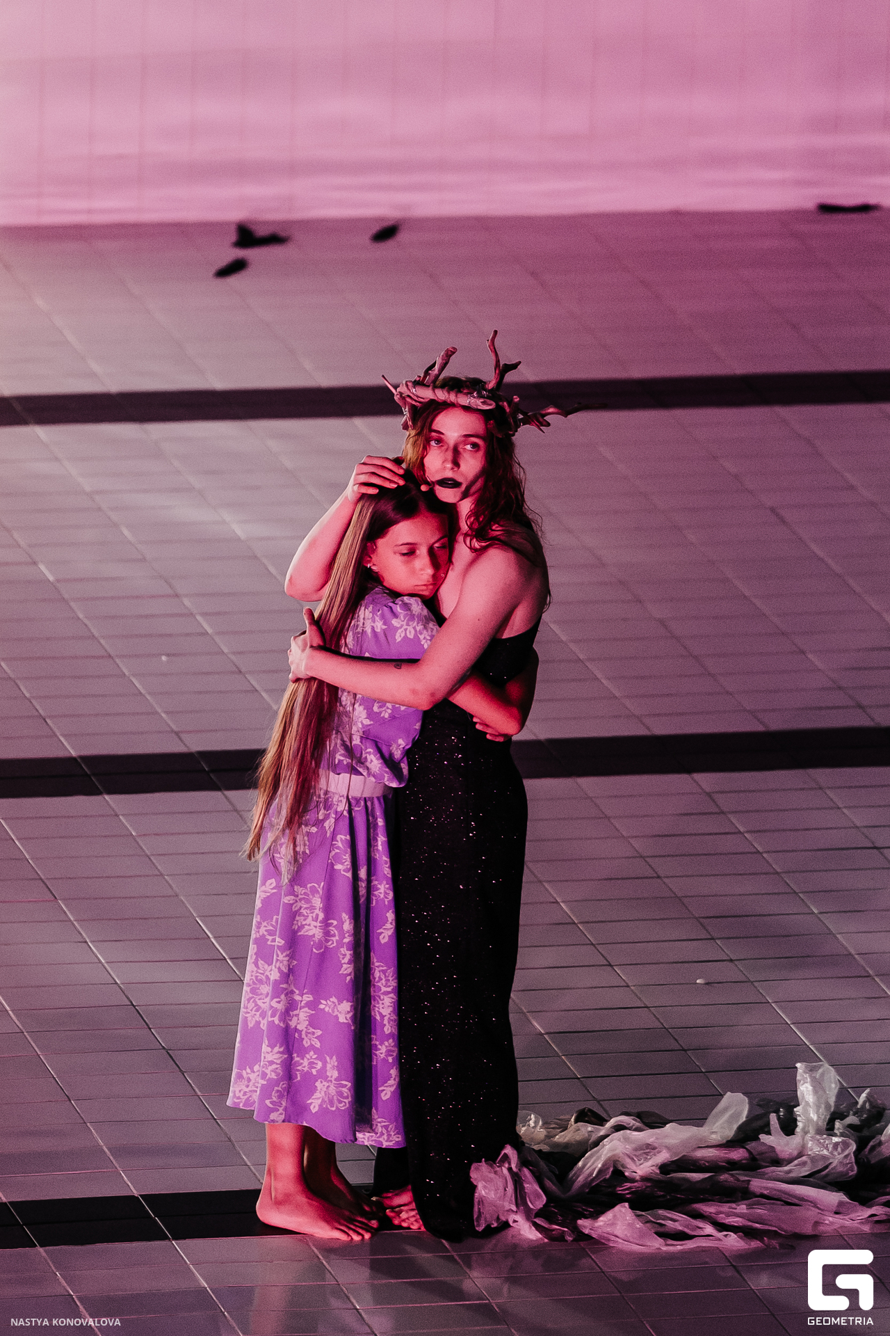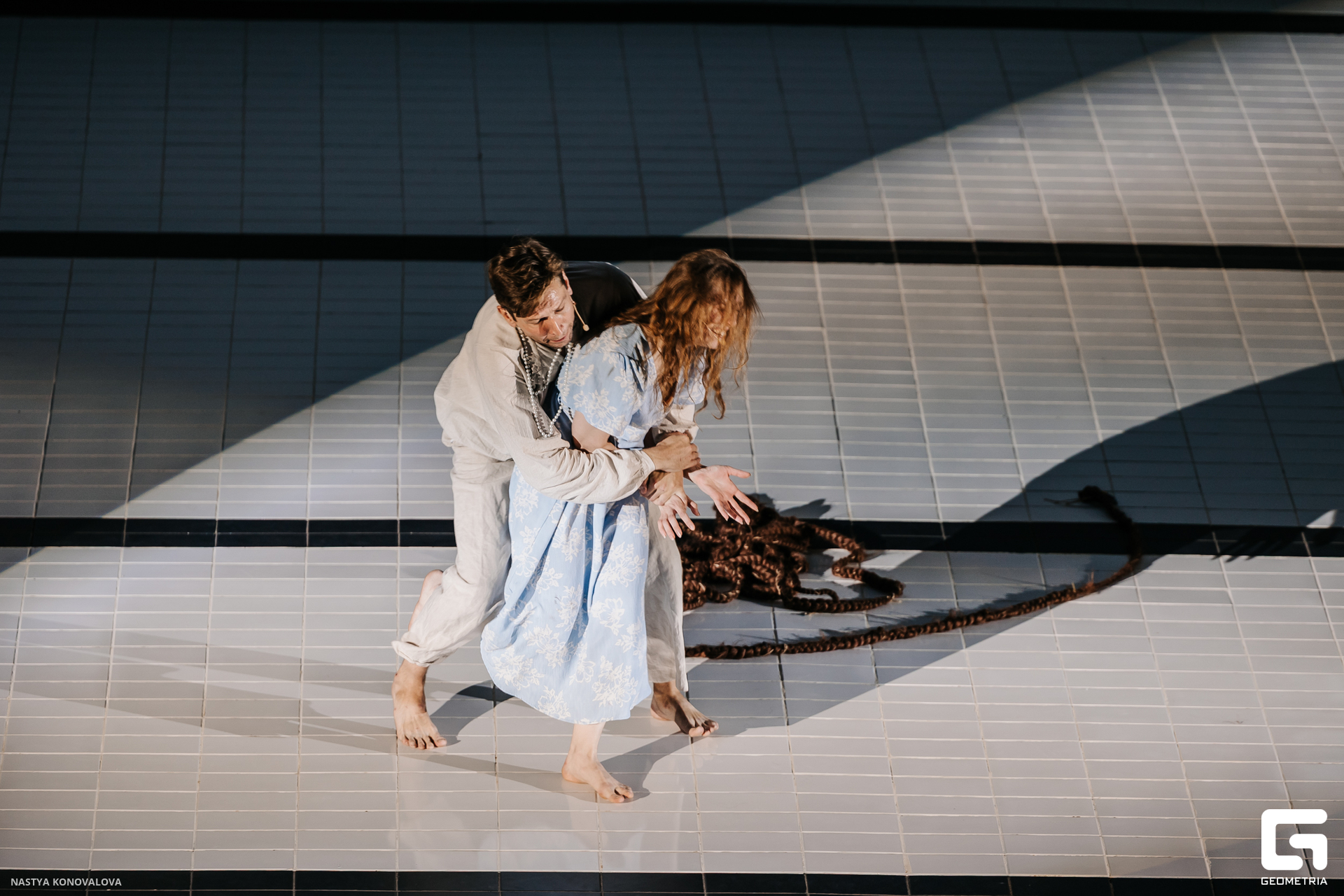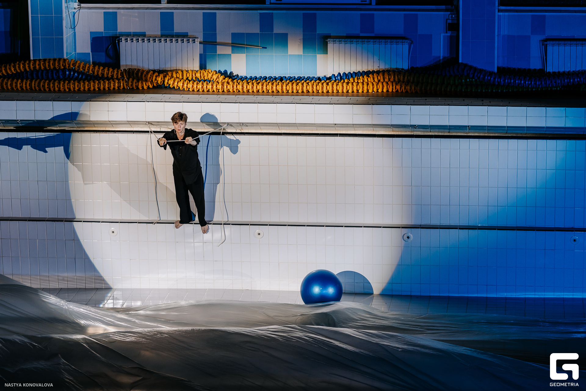 В спектакле Екатерины Половцевой пустой бассейн, ожидающий наполнения, — как омут сомнений, из которых невозможно выбраться. Постоянное ожидание избавления от тревог, самоистязания, чувство вины, надежда на то, что крепко запутанный клубок предательств разрешится и настанет счастливое, спокойное, безмятежное время. Но в этом ожидании жизнь замирает, гниёт и человек превращается в собственную тень.