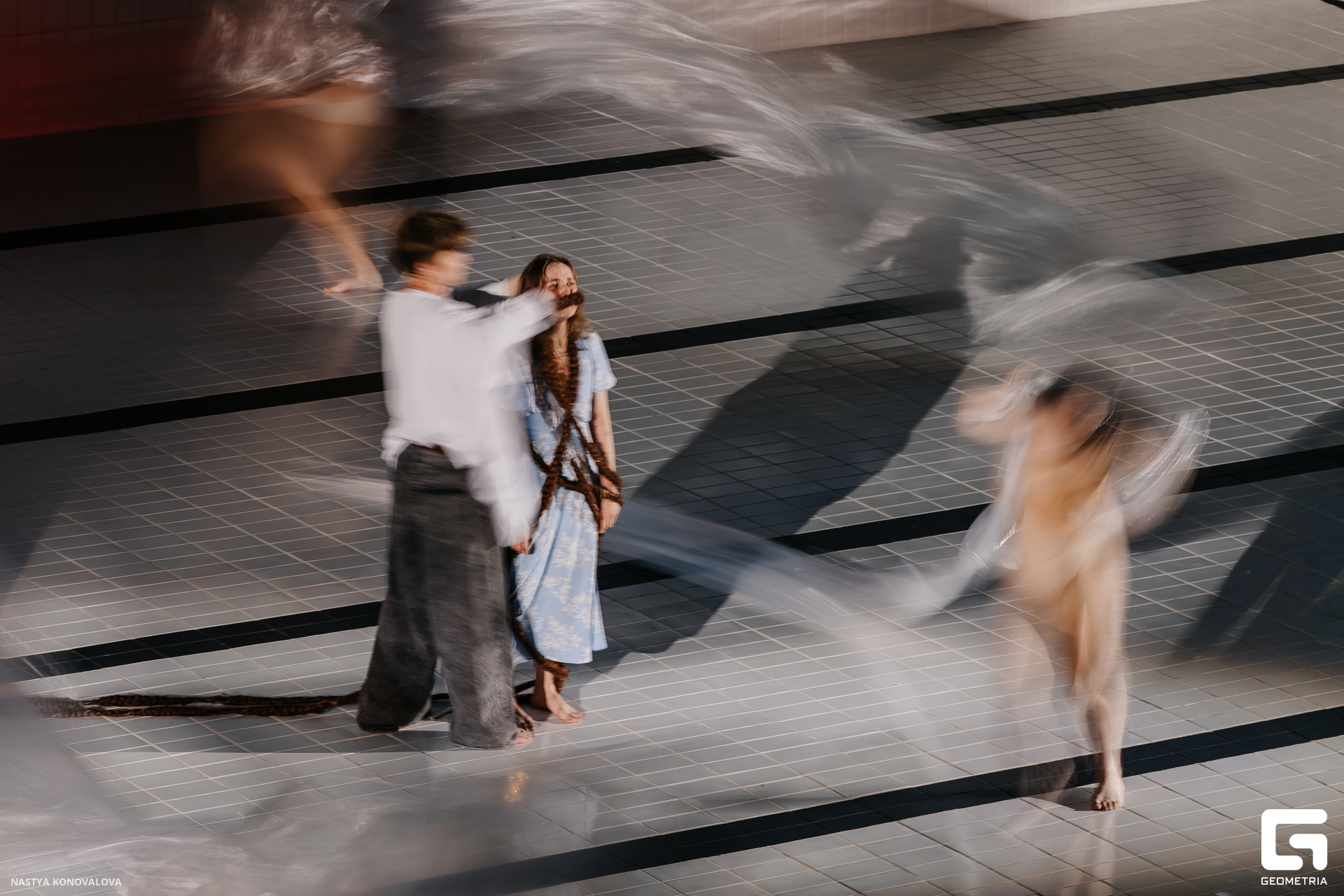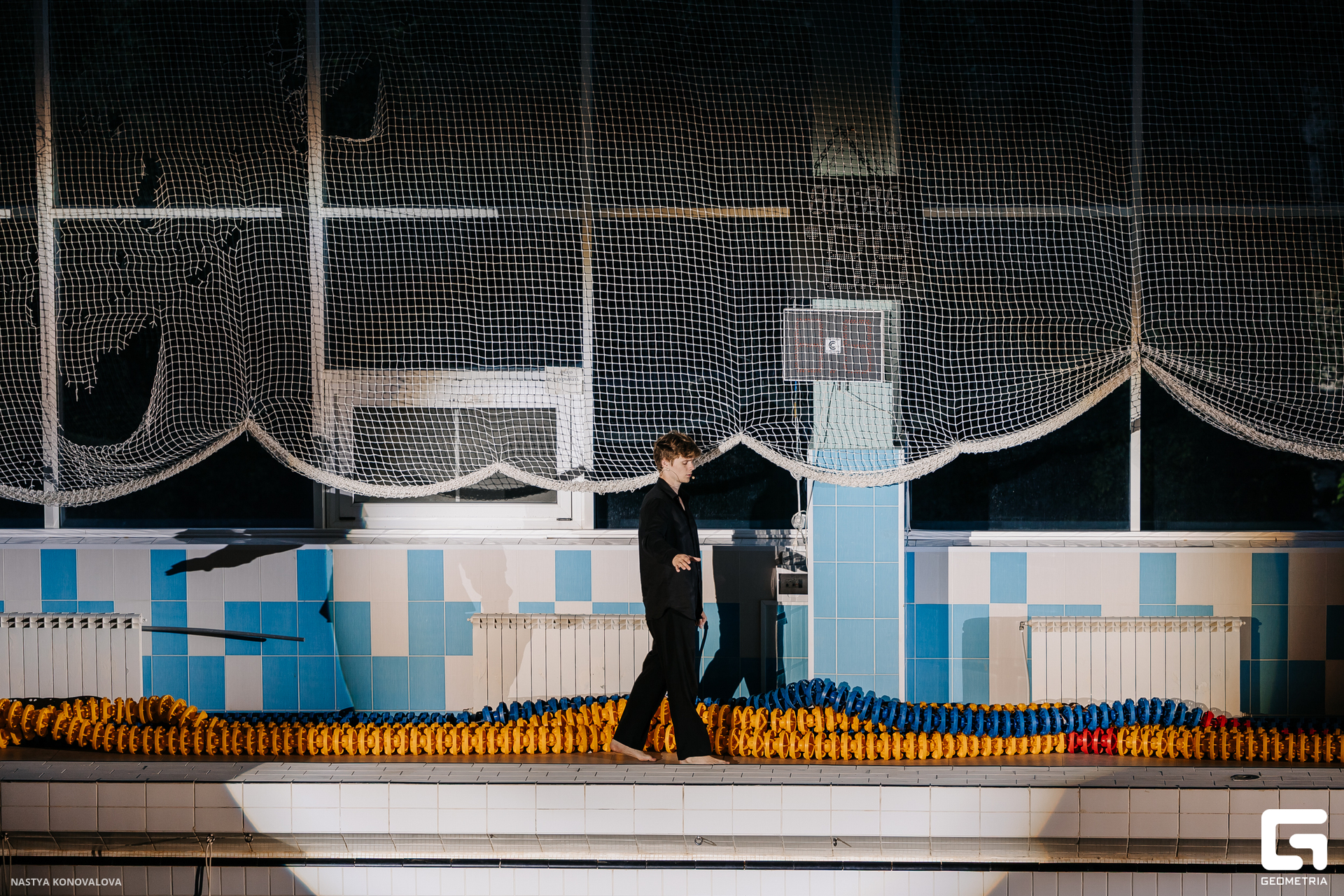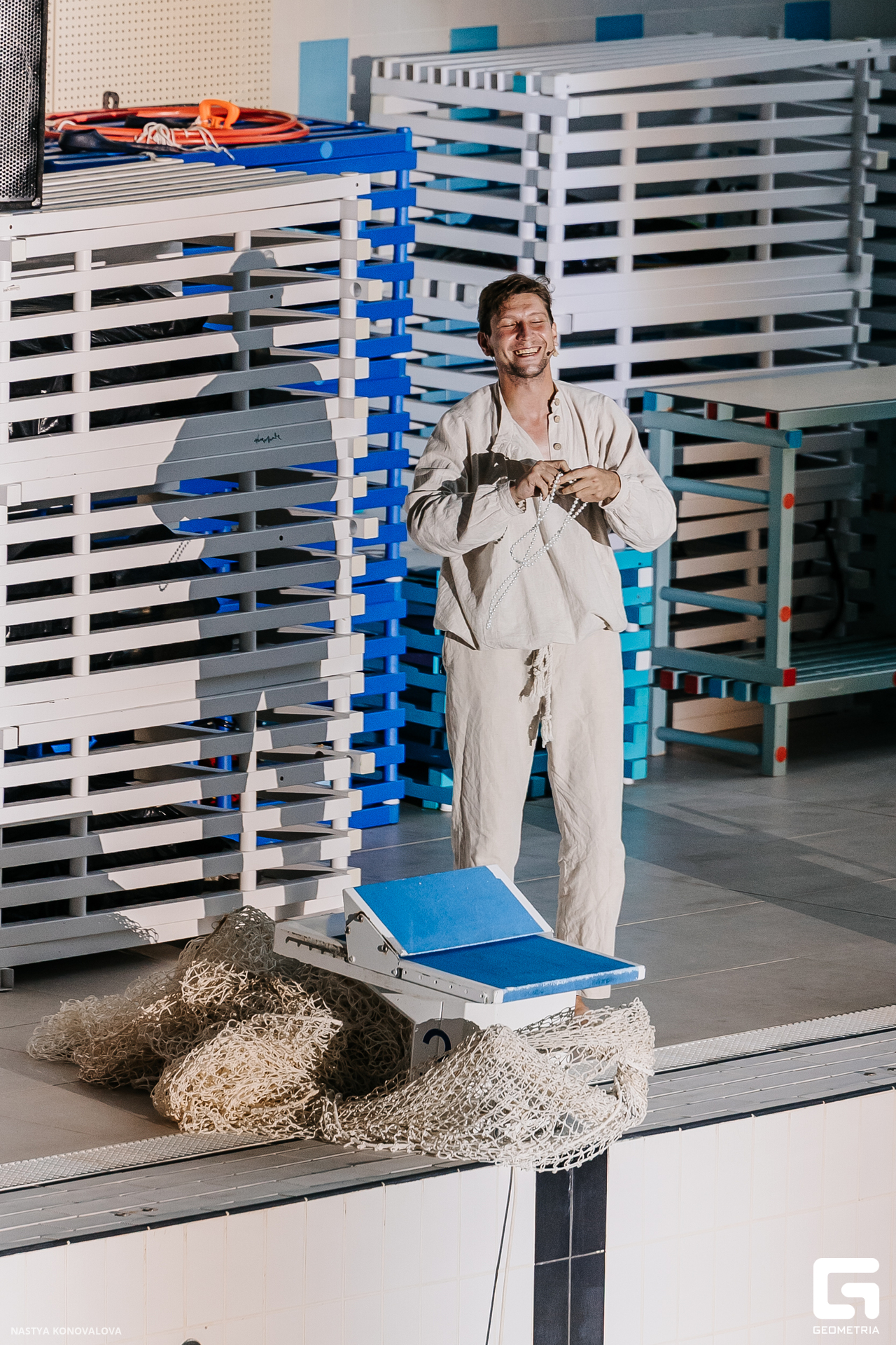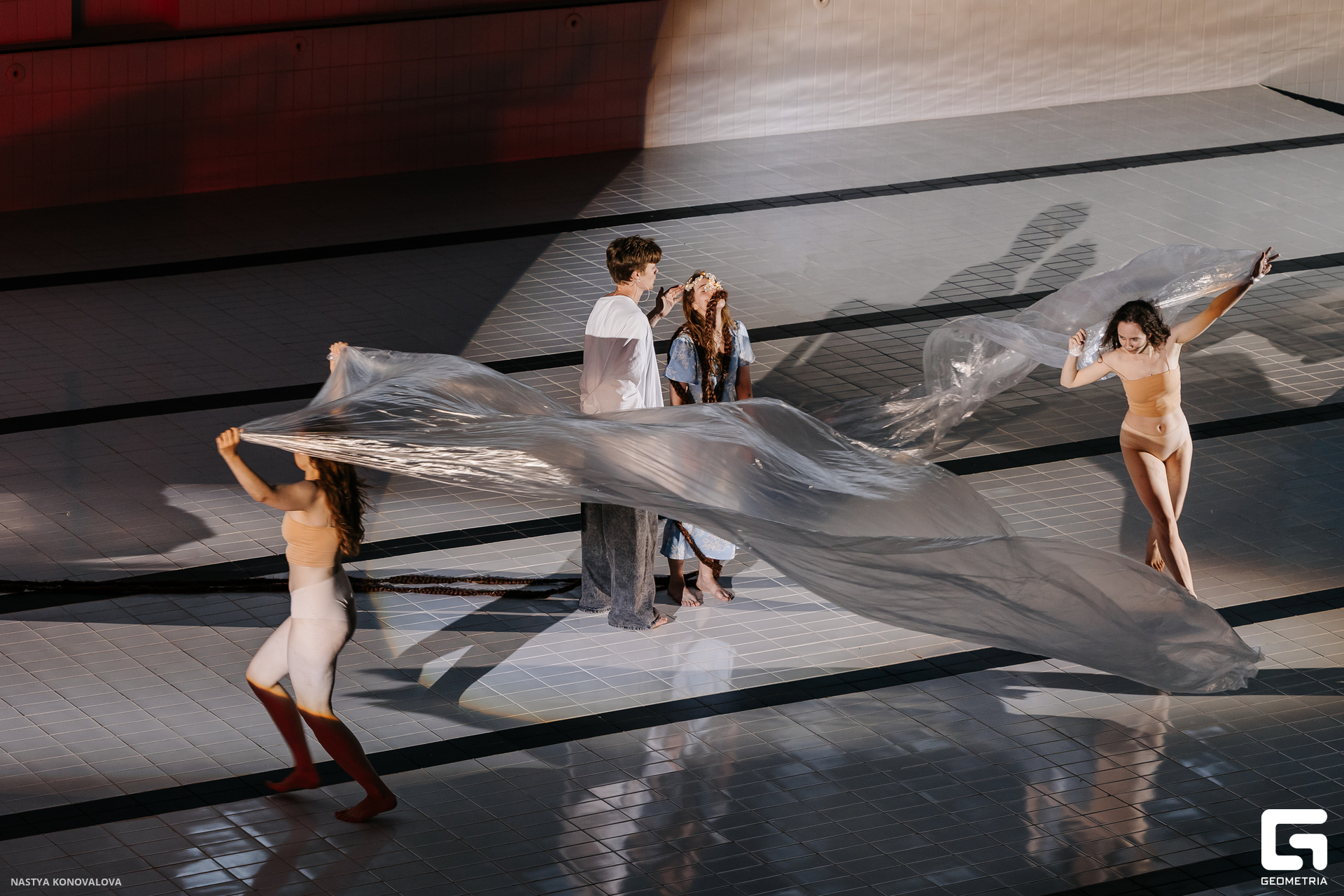 В спектакле Екатерины Половцевой пустой бассейн, ожидающий наполнения, — как омут сомнений, из которых невозможно выбраться. Постоянное ожидание избавления от тревог, самоистязания, чувство вины, надежда на то, что крепко запутанный клубок предательств разрешится и настанет счастливое, спокойное, безмятежное время. Но в этом ожидании жизнь замирает, гниёт и человек превращается в собственную тень.