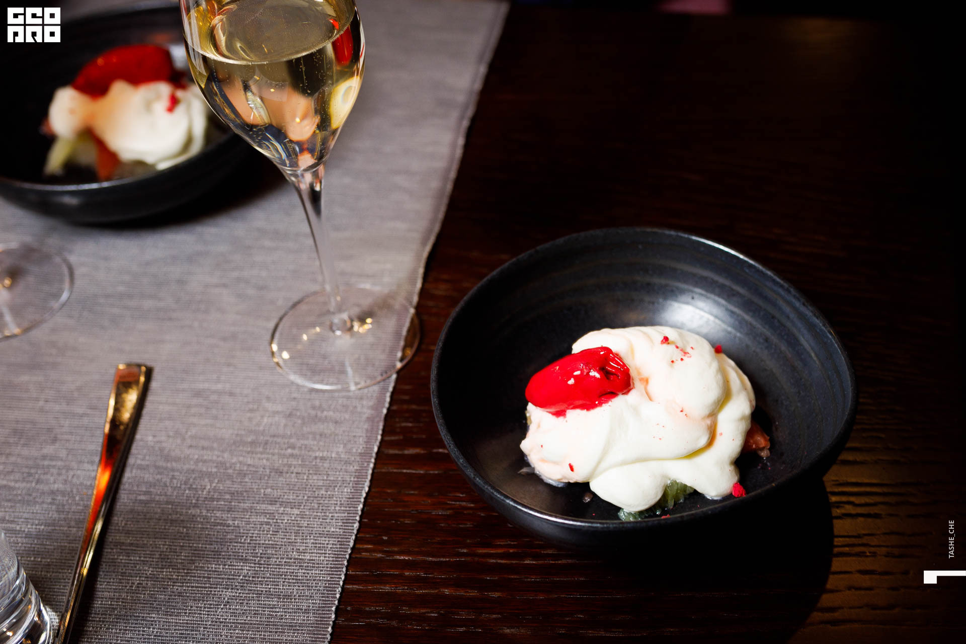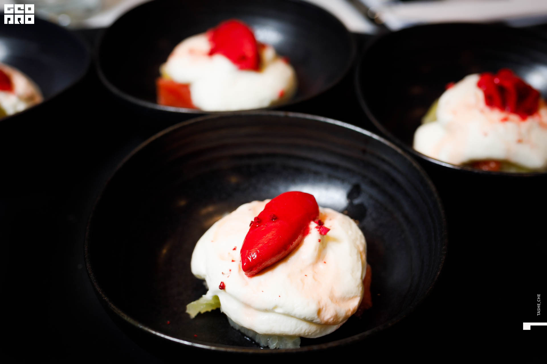Закуска из малосольного огурца с термостатным йогуртом, кремом из томатов и сибасом