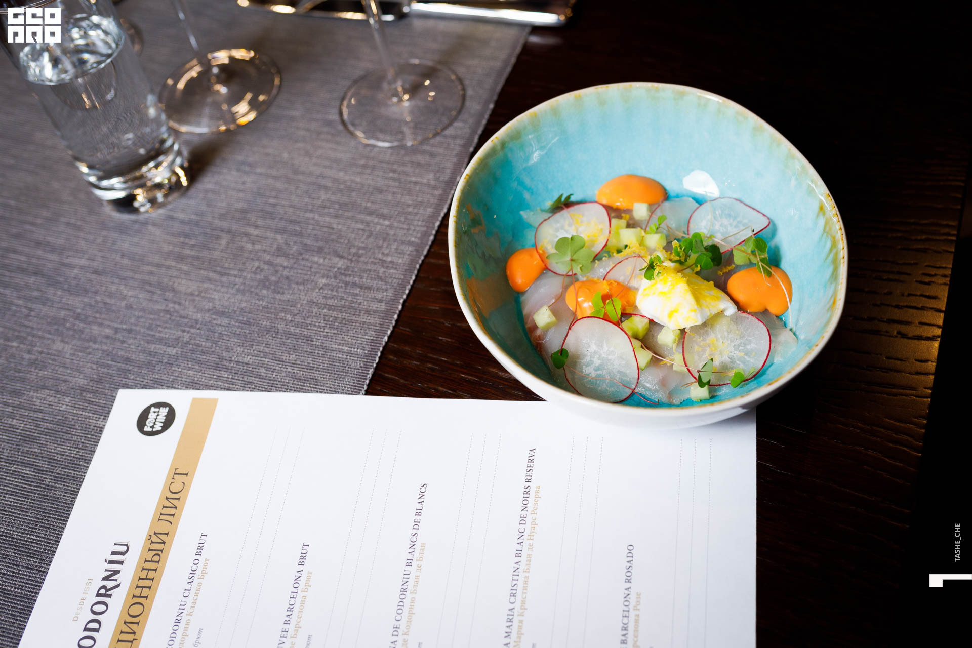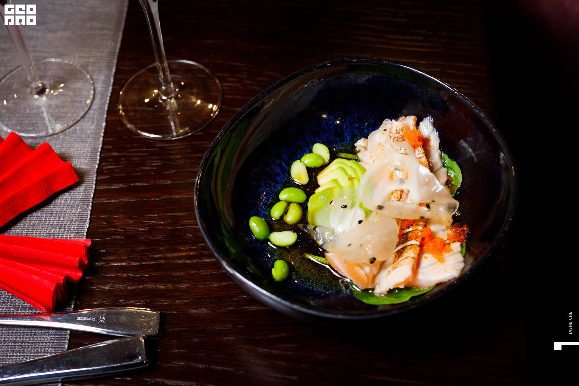 Татаки из лосося, кольраби, тобико в кисло-сладком соусе